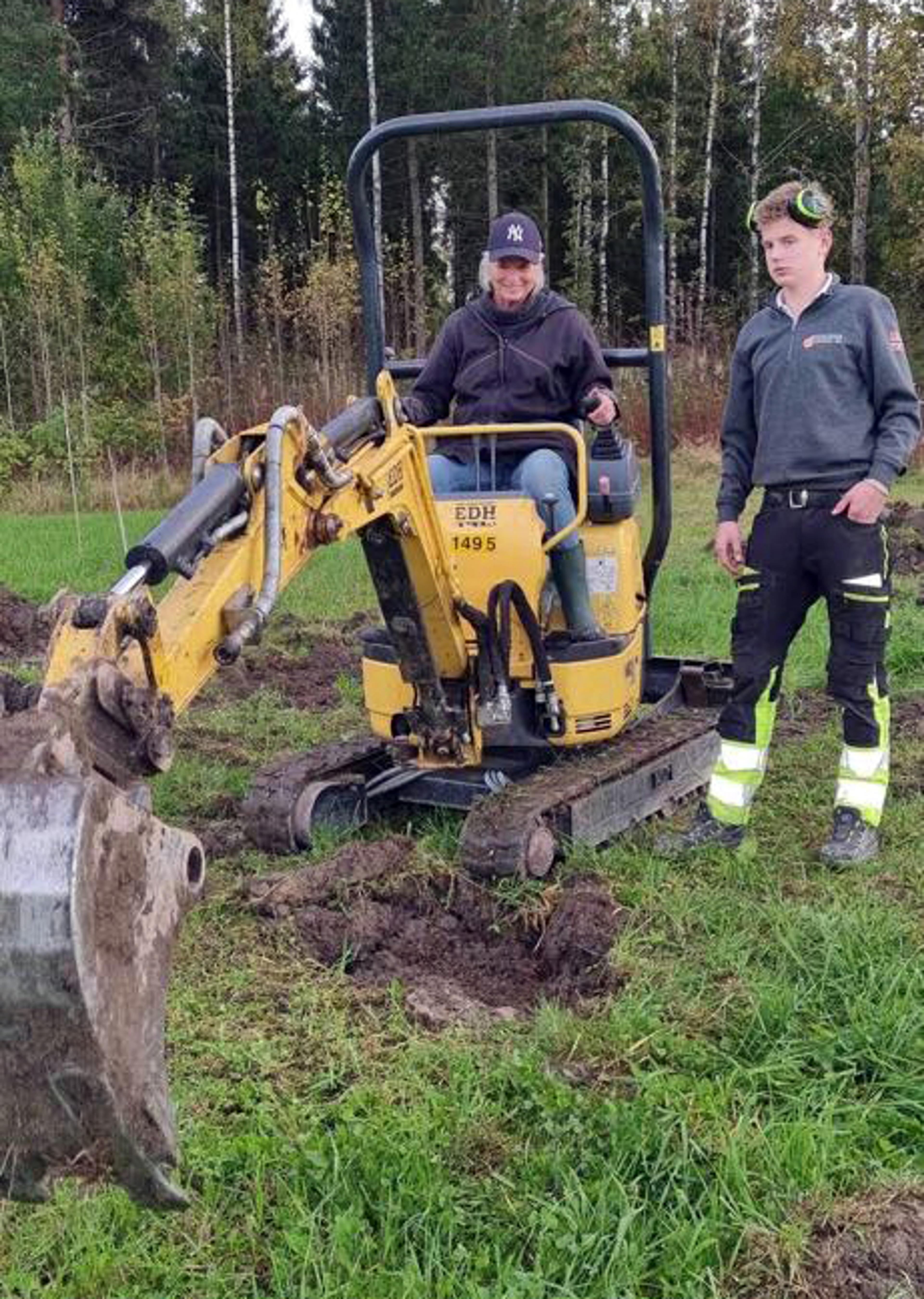 Styreleder og lege til daglig Ingunn Henriksen Leeber bytter beite og prøver seg som gravemaskinfører, under kyndig veiledning. Foto: Privat.