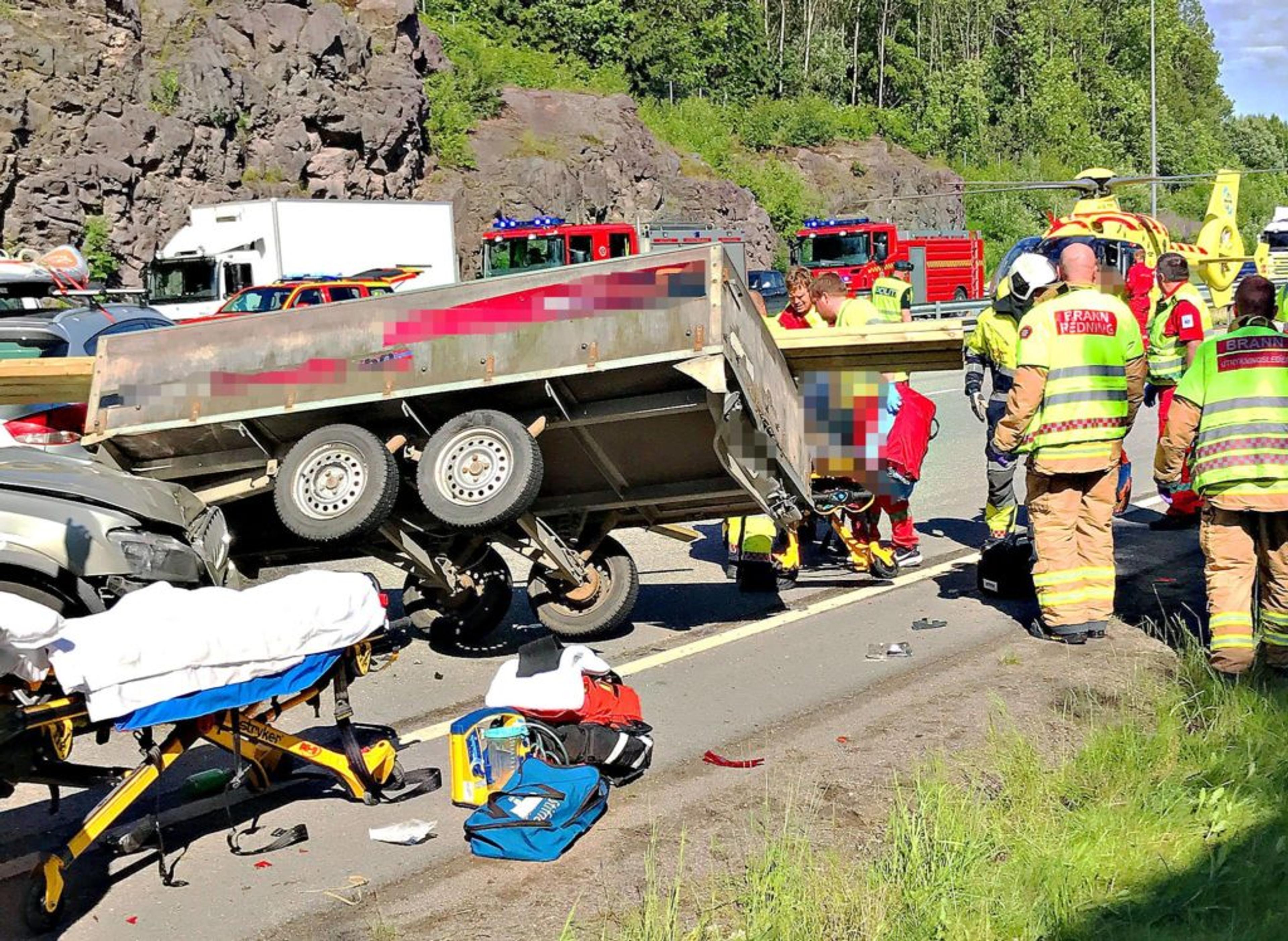 Ifølge politiet har en trailer kjørt inn i flere biler bakfra, i en stillestående kø.