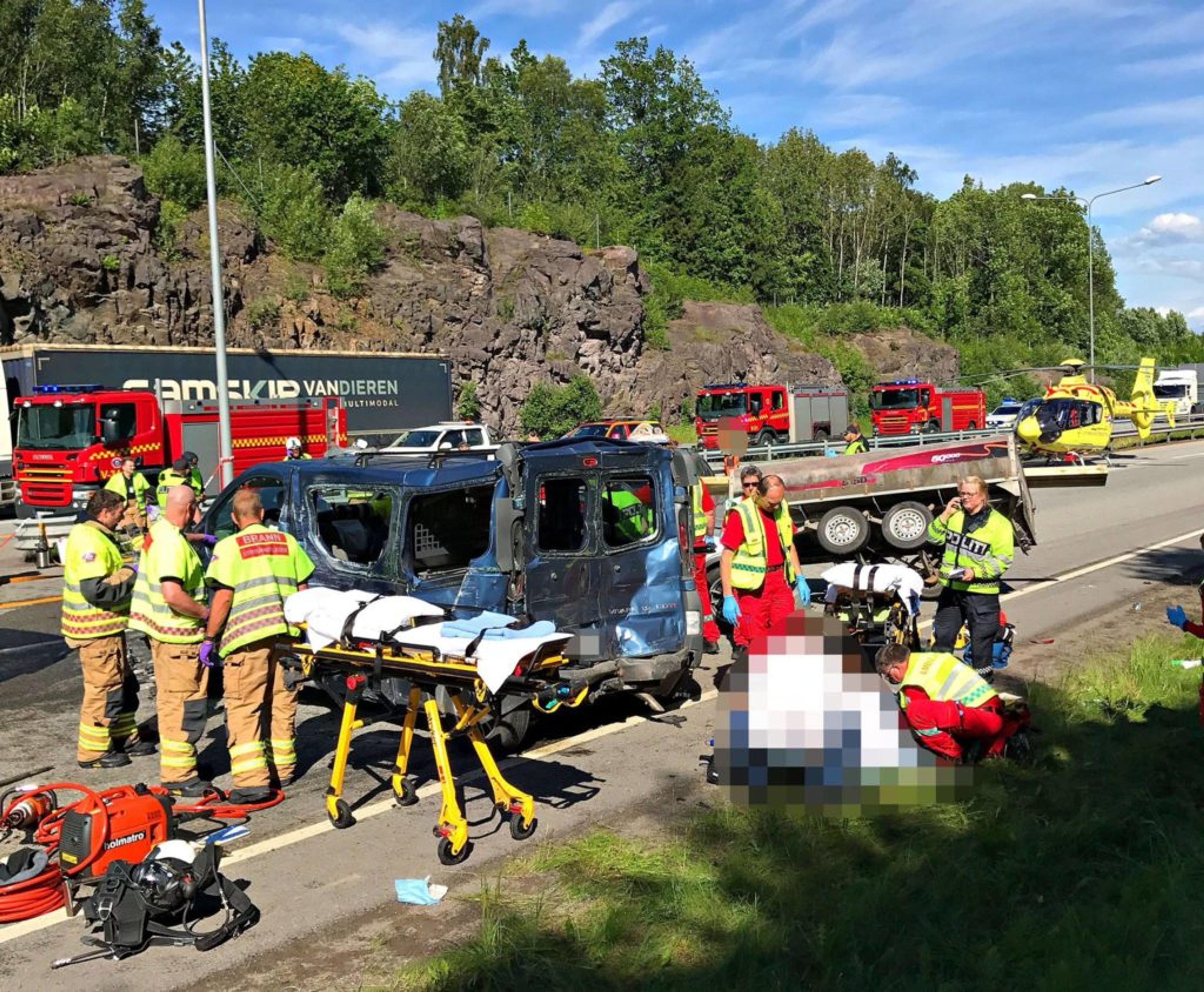 Ulykkesgruppa jobber fortsatt på stedet, snart to timer etter ulykken inntraff. Sørgående retning er fremdeles stengt.