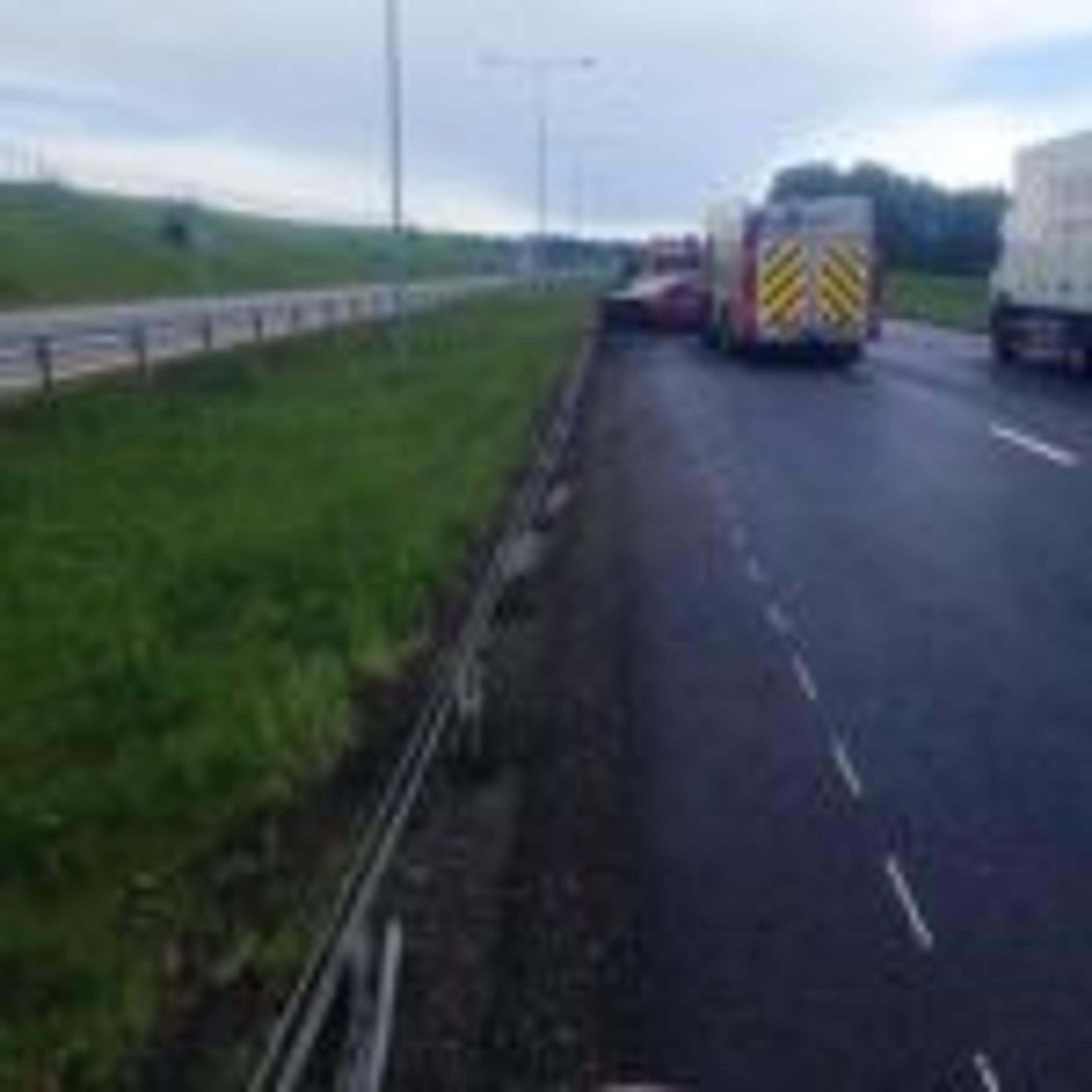 KUN MATERIELLE SKADER: I den første ulykken gikk det bra med sjåføren, melder nødetatene. Det gikk verst utover vaier-autovernet mellom kjøreretningene. Foto: VIB.