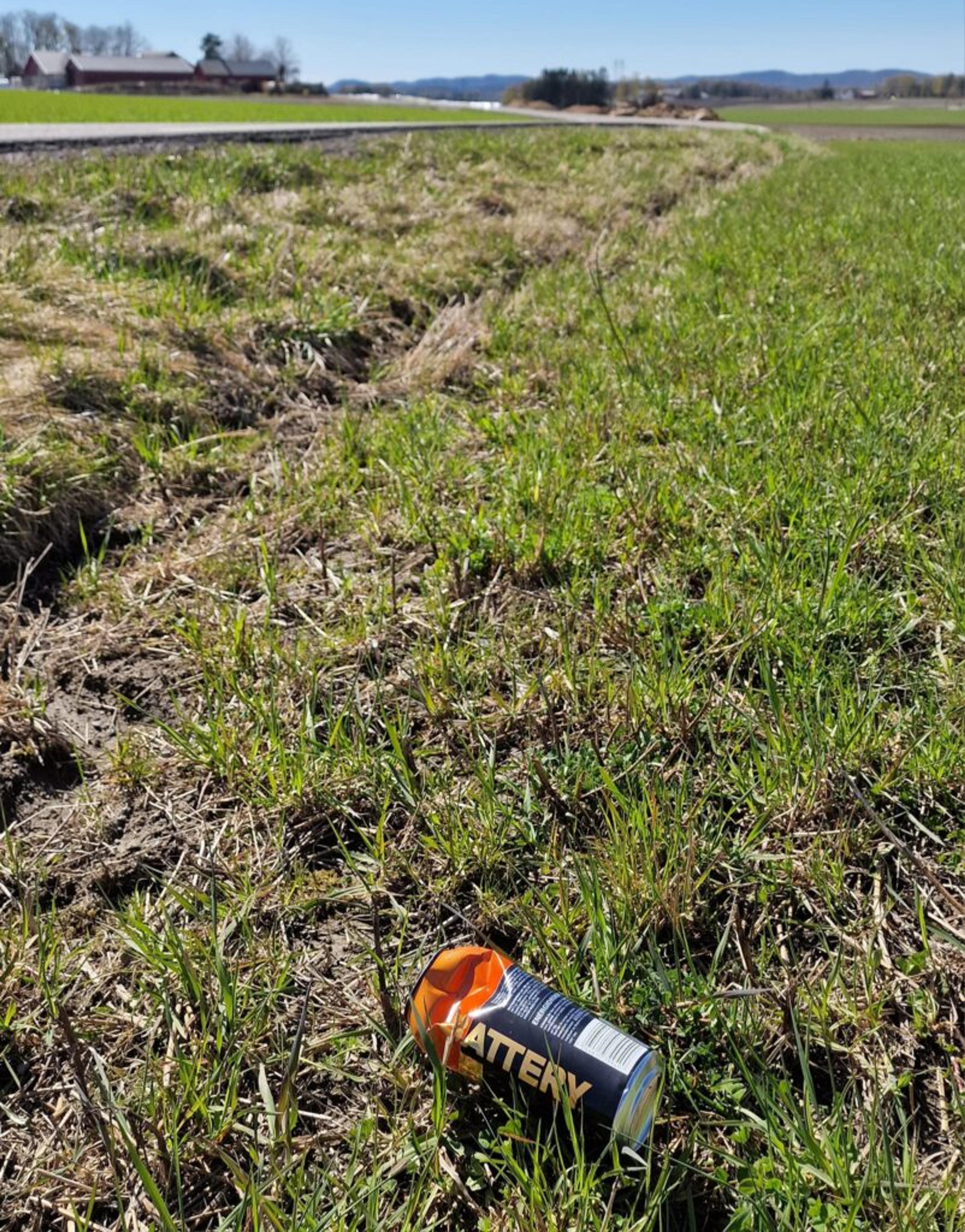 TOTALT UAKSEPTABELT: Det er så feil, på så vanvittig mange måter, å bare kaste søppel ut av bilvindu. Ekstra ille er det når det gjelder tomgods som kan bli til drapsvåpen for dyra som risikerer å få det i seg. Foto: Privat.