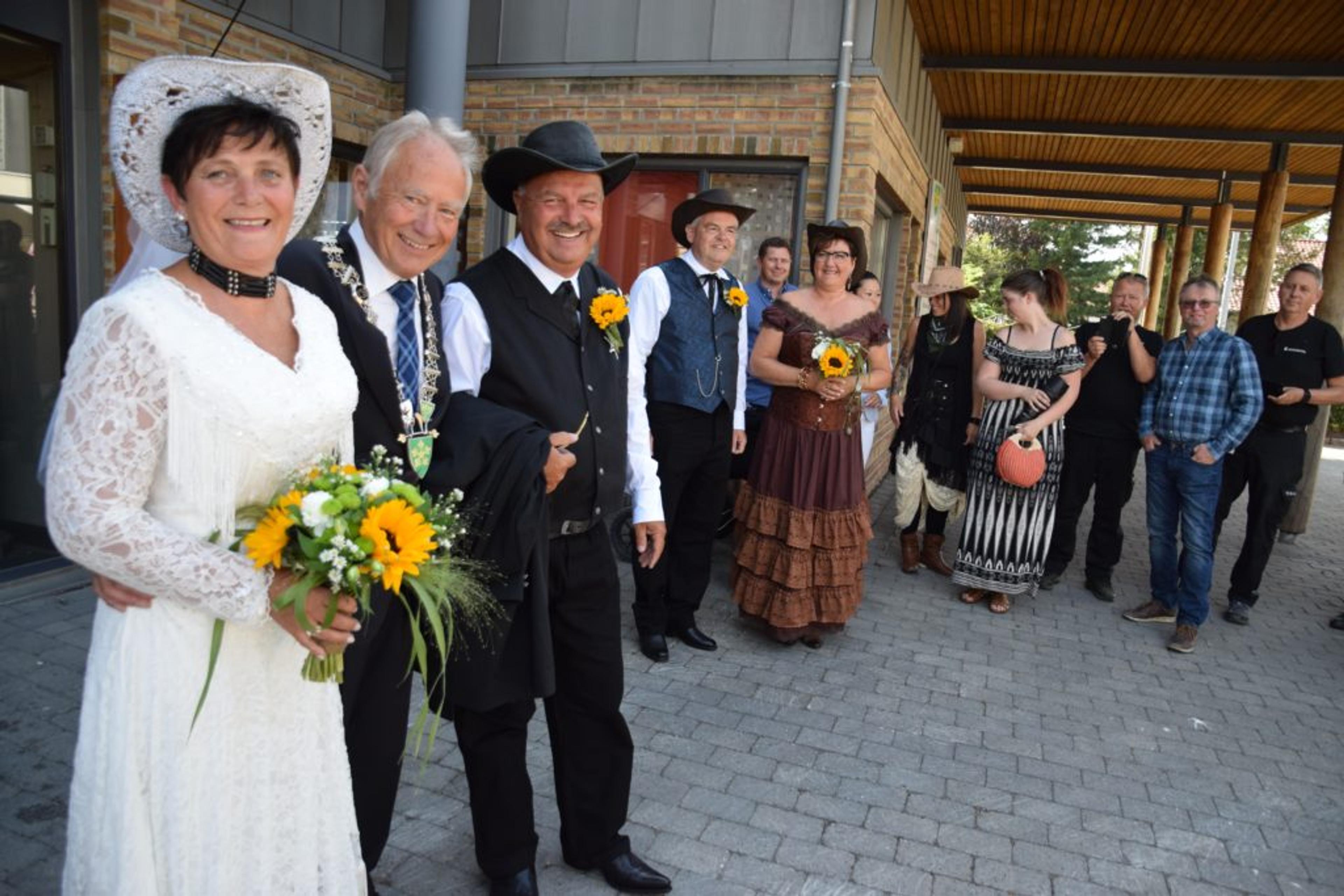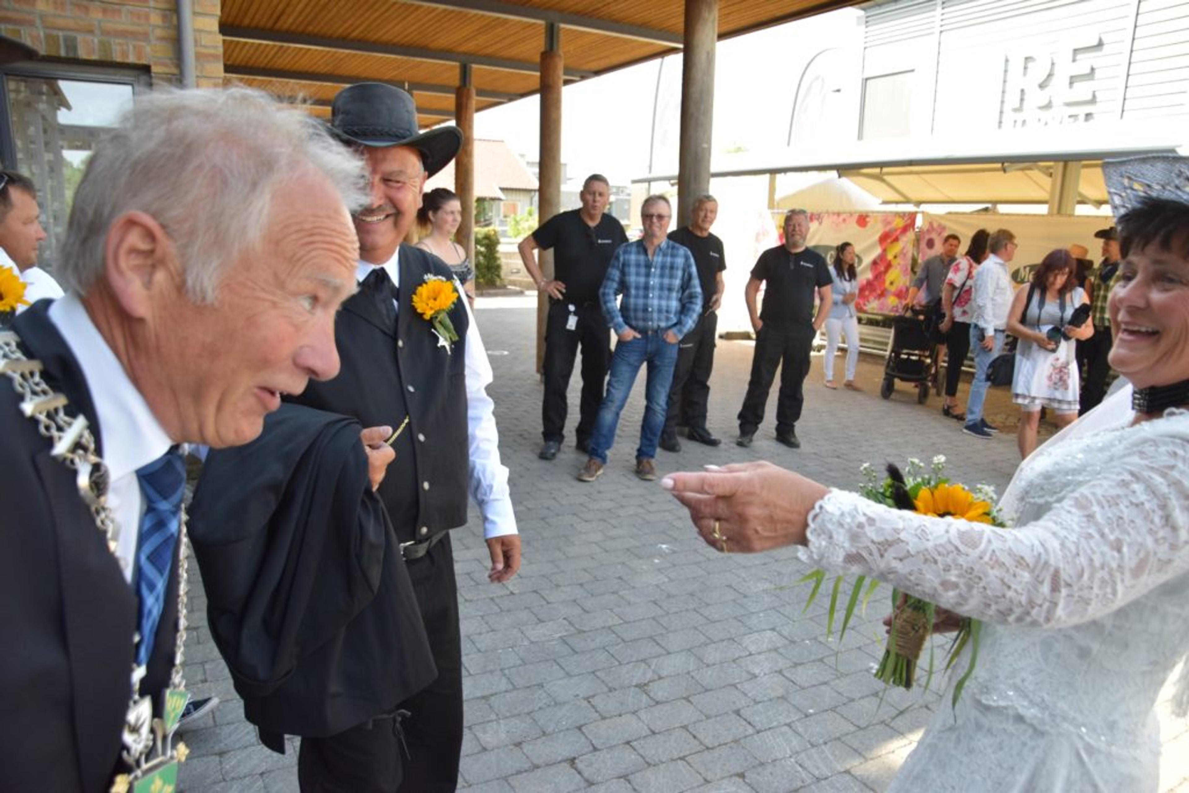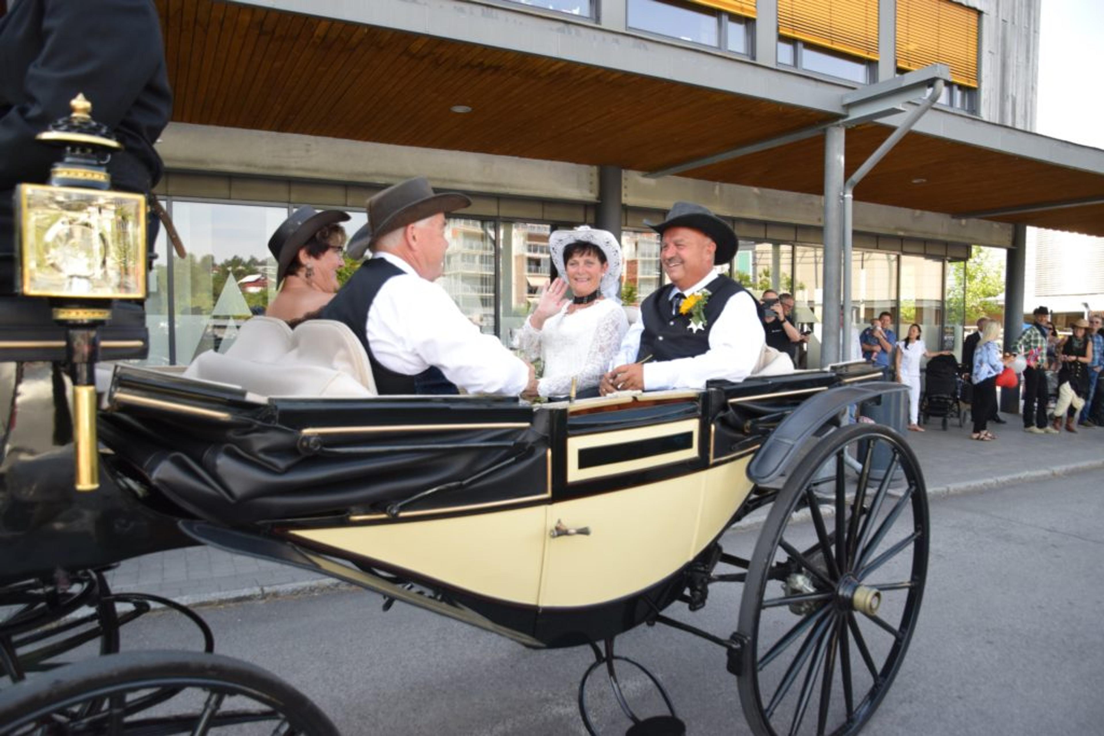 YIIIHAA! Thorvald spurte, og brudeparet sa ja. Det skapte stor stemning utenfor kommunehuset på Revetal. Deretter ble det cowboyfest i Bekkefare. Foto: Stian Ormestad.