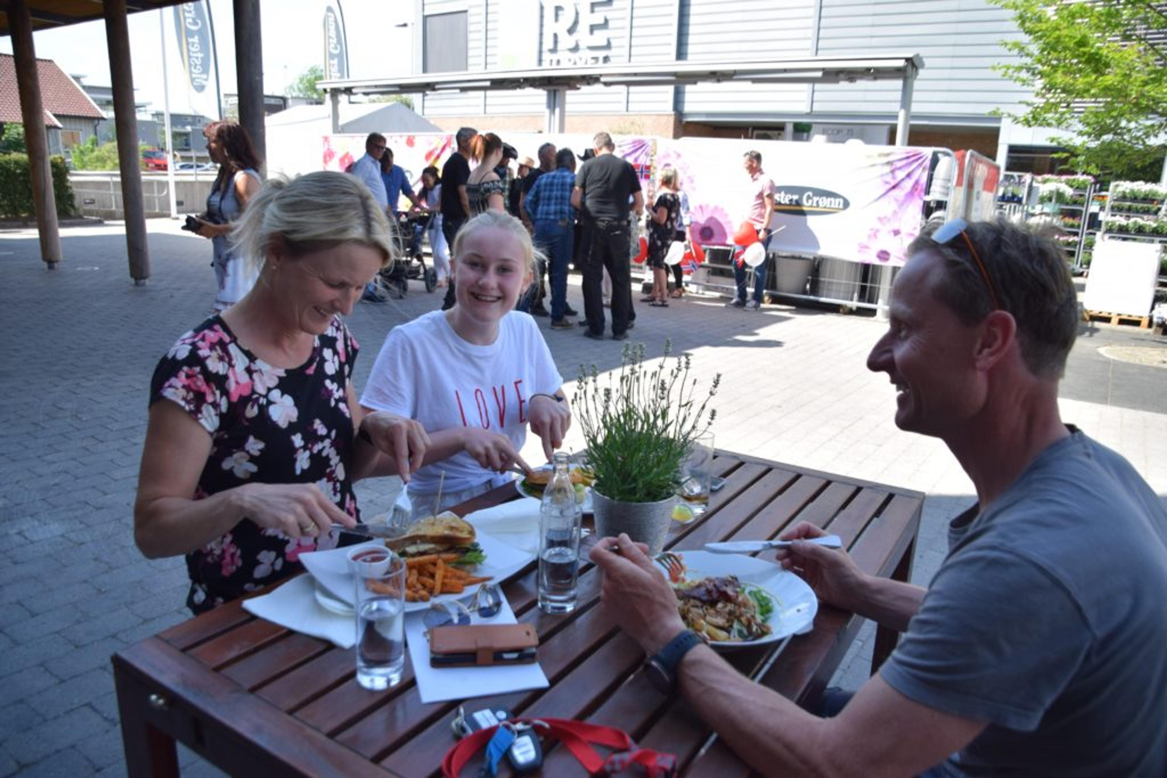 HAVNA MIDT I EN BRYLLUPSFEST: Familien Vang fra Larvik spiser middag på uteserveringen på Restauranten. De synes det bare var moro å havne midt oppi bryllupsfesten, da brudeparet kom ut av kommunehuset til skål og stor ståhei. Foto: Stian Ormestad.