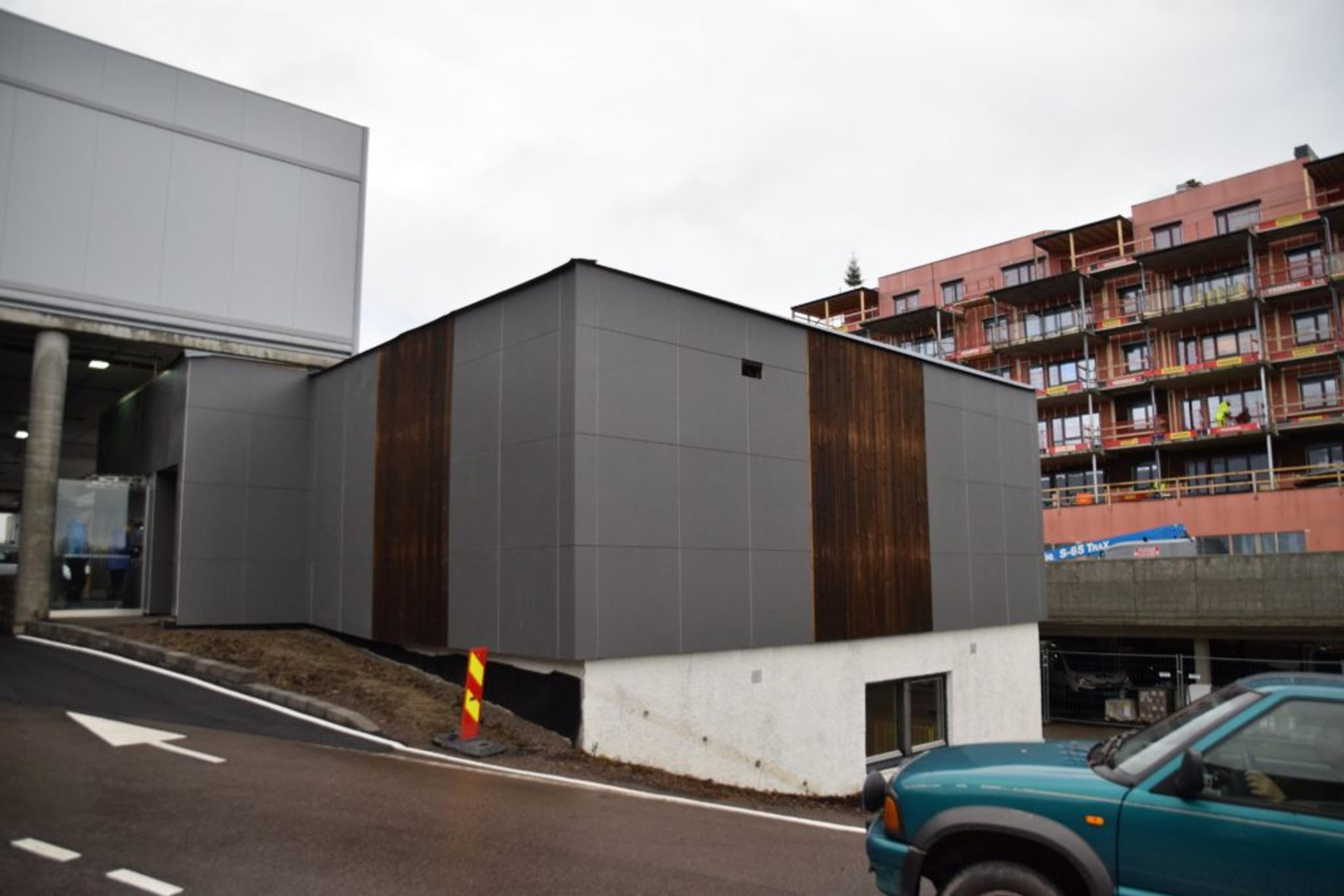 BANKBYGGET I NY DRAKT: Det gamle bankbygget er blitt splitta i to, og nå kles det i en ny innpakning. De ReAvisa prata med torsdag formiddag synes det blir veldig flott og moderne. Foto: Stian Ormestad.