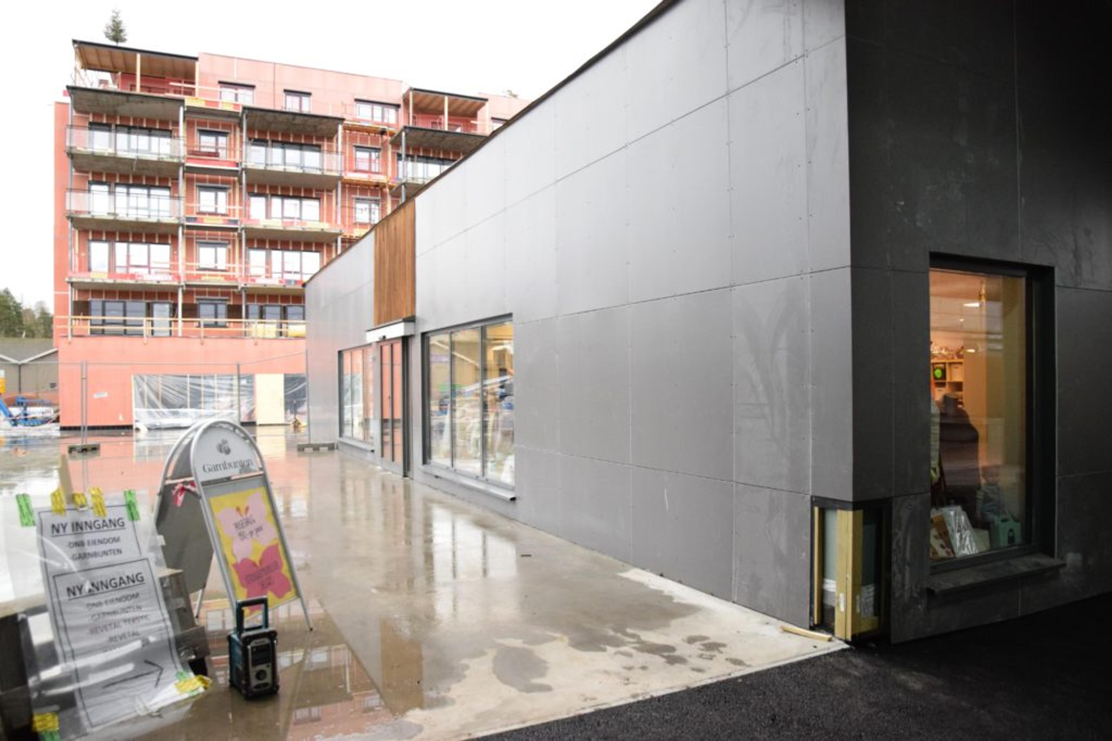 STRAKS INNFLYTTINGSKLART: Rett over på nyåret begynner de første å flytte inn her – og Revetal vokser med enda 800 kvadratmeter næring og 27 nye leiligheter. Mot nord er ikke den nye fasaden på plass på det gamle bankbygget. Foto: Stian Ormestad.
