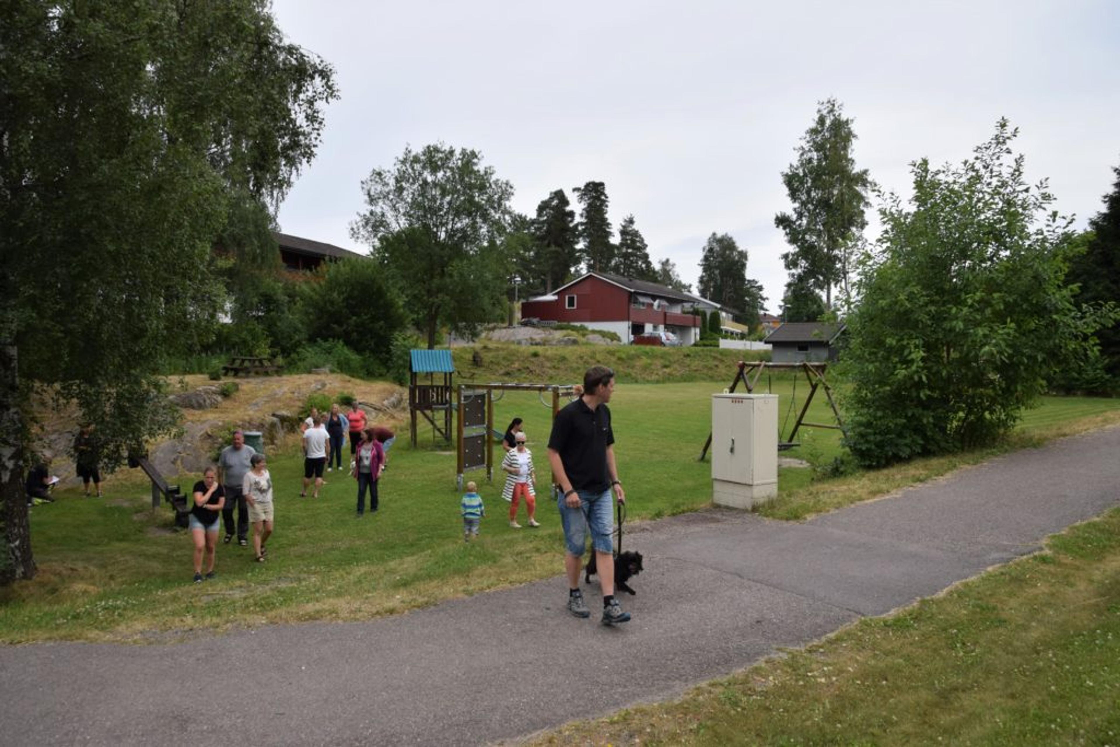Naboene møttes på lekeplassen for å skrive under på et felles brev til Re kommune. ReAvisa ble med en liten gjeng av naboene en runde i Bratthenget etter signeringen.
