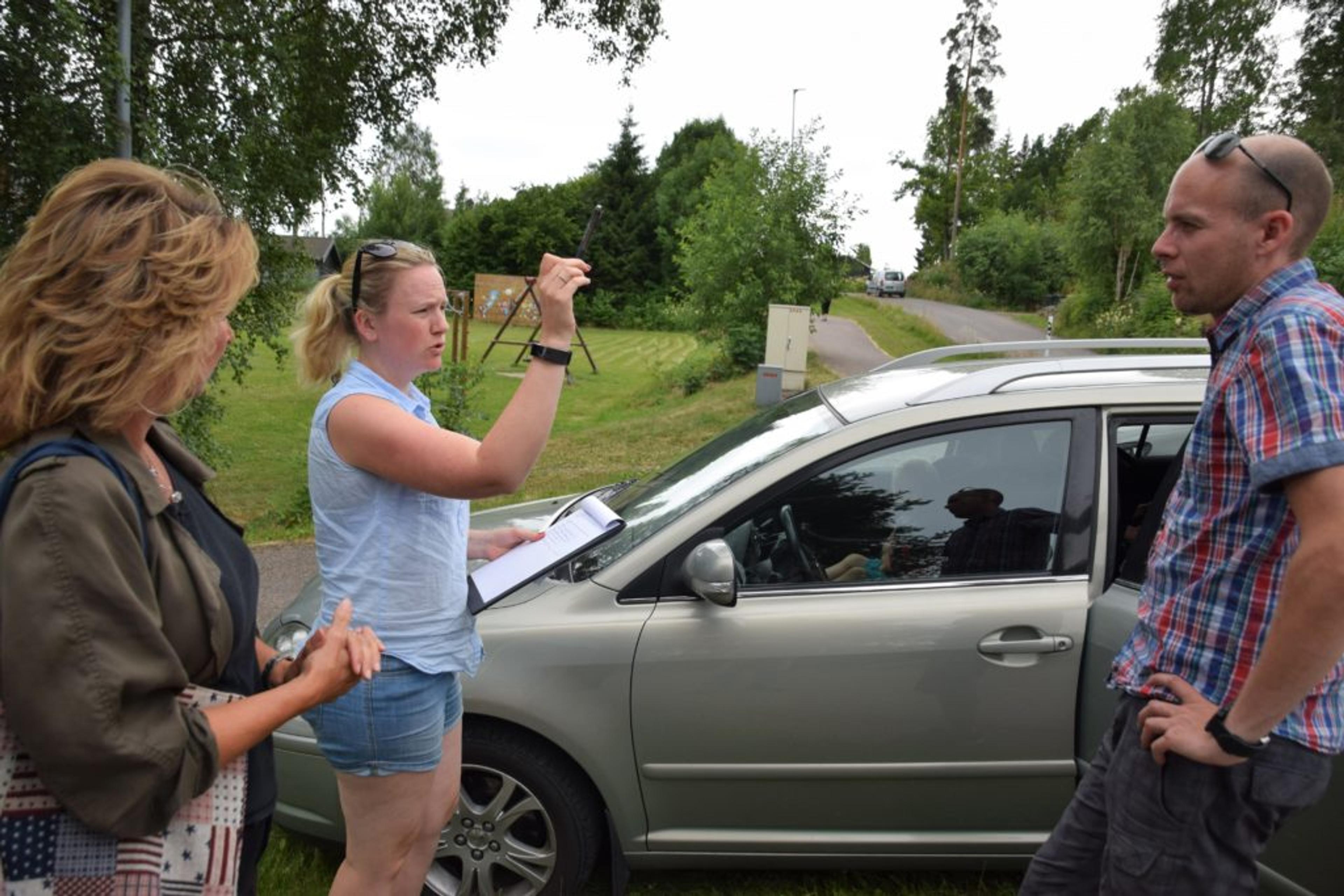 SKRIVER UNDER: Ikke alle rakk møtet på lekeplassen. Martine Lilleby og Steinar Sanni skriver her under på brevet på vei forbi i bilen. Foto: Stian Ormestad.
