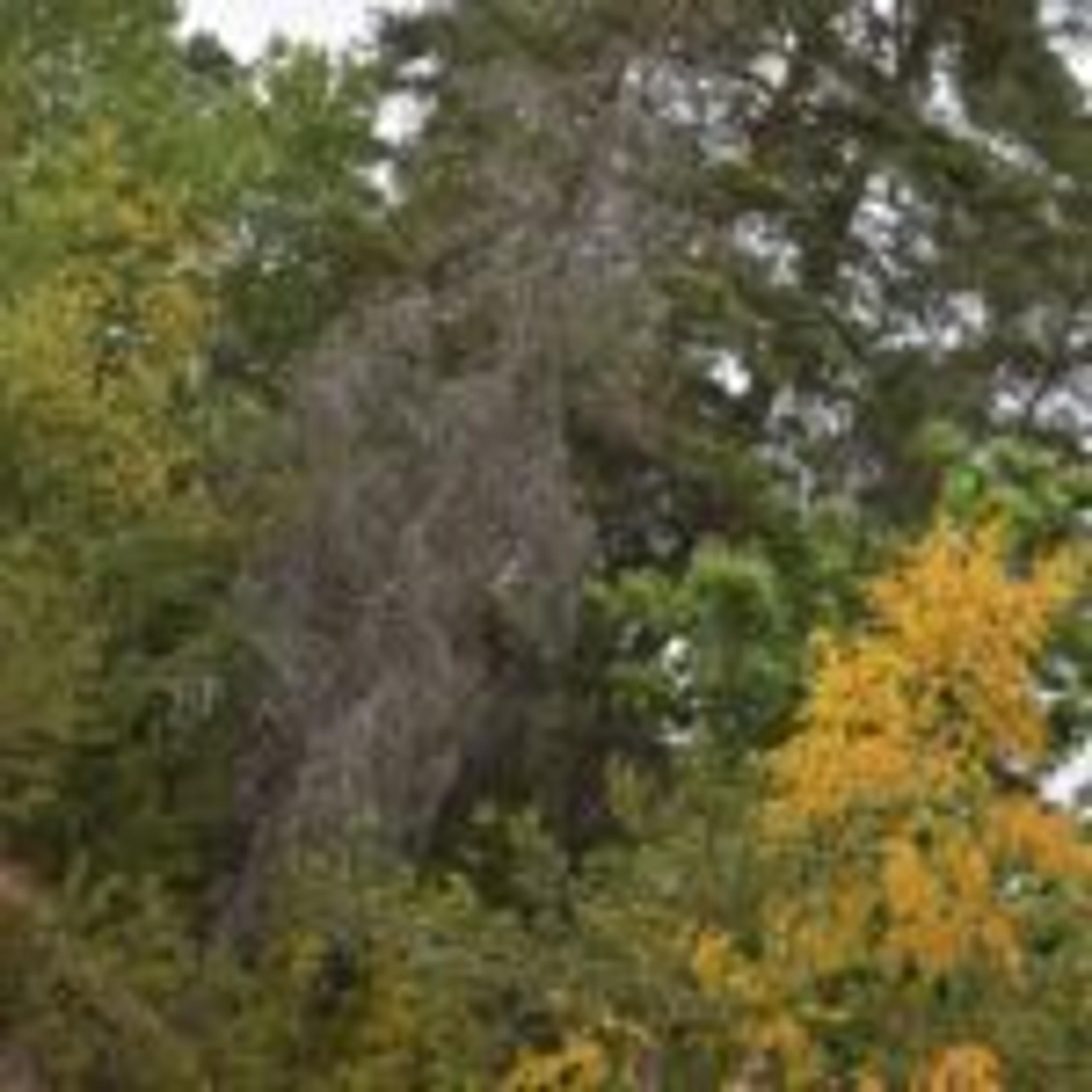 DØDE OG TØRRE TRÆR: Her kommer det til å ramle flere trær, viser naboene fram. De mener kommunen må sørge for sikkerheten i sin egen skau, så nærme bebyggelse. Foto: Stian Ormestad.