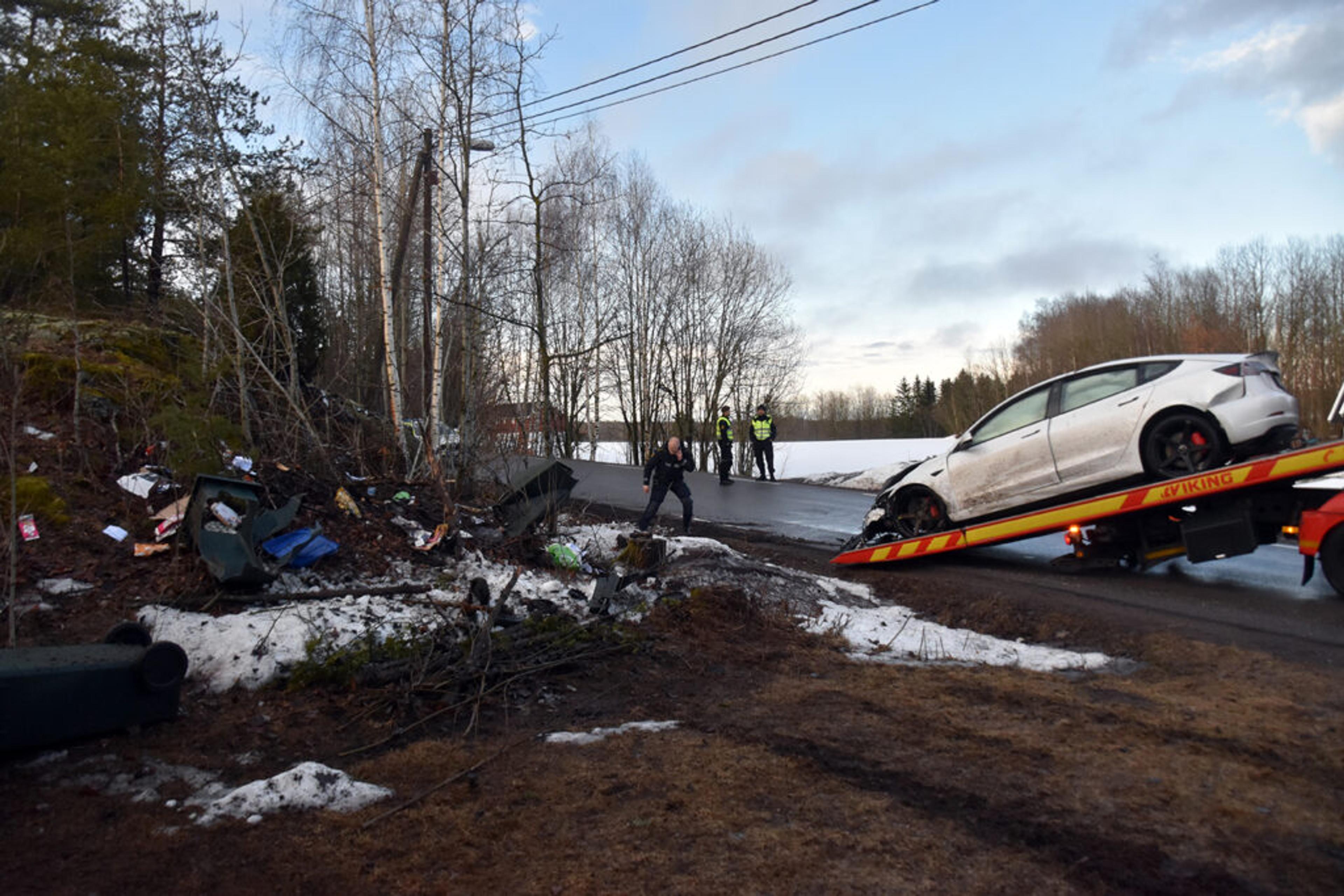 – Bilen har dratt av veien, airbager utløst. Vi har sikra skadestedet og tatt strømmen på bilen, forteller underbrannmester Donald J. Bell.