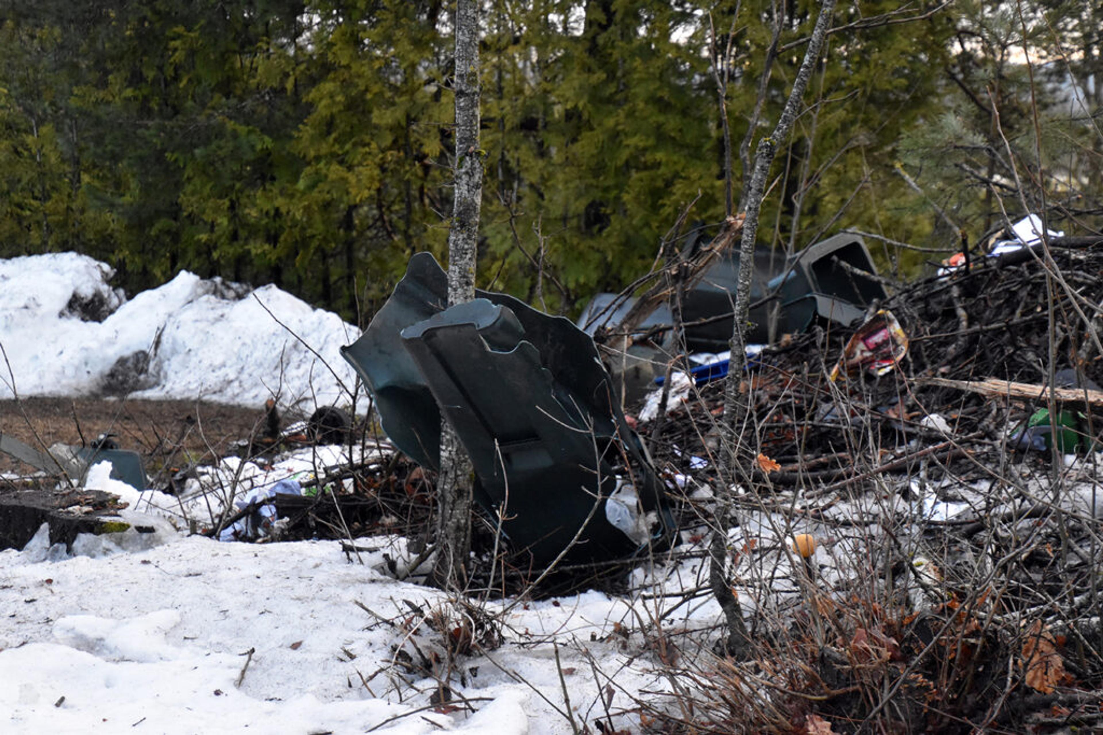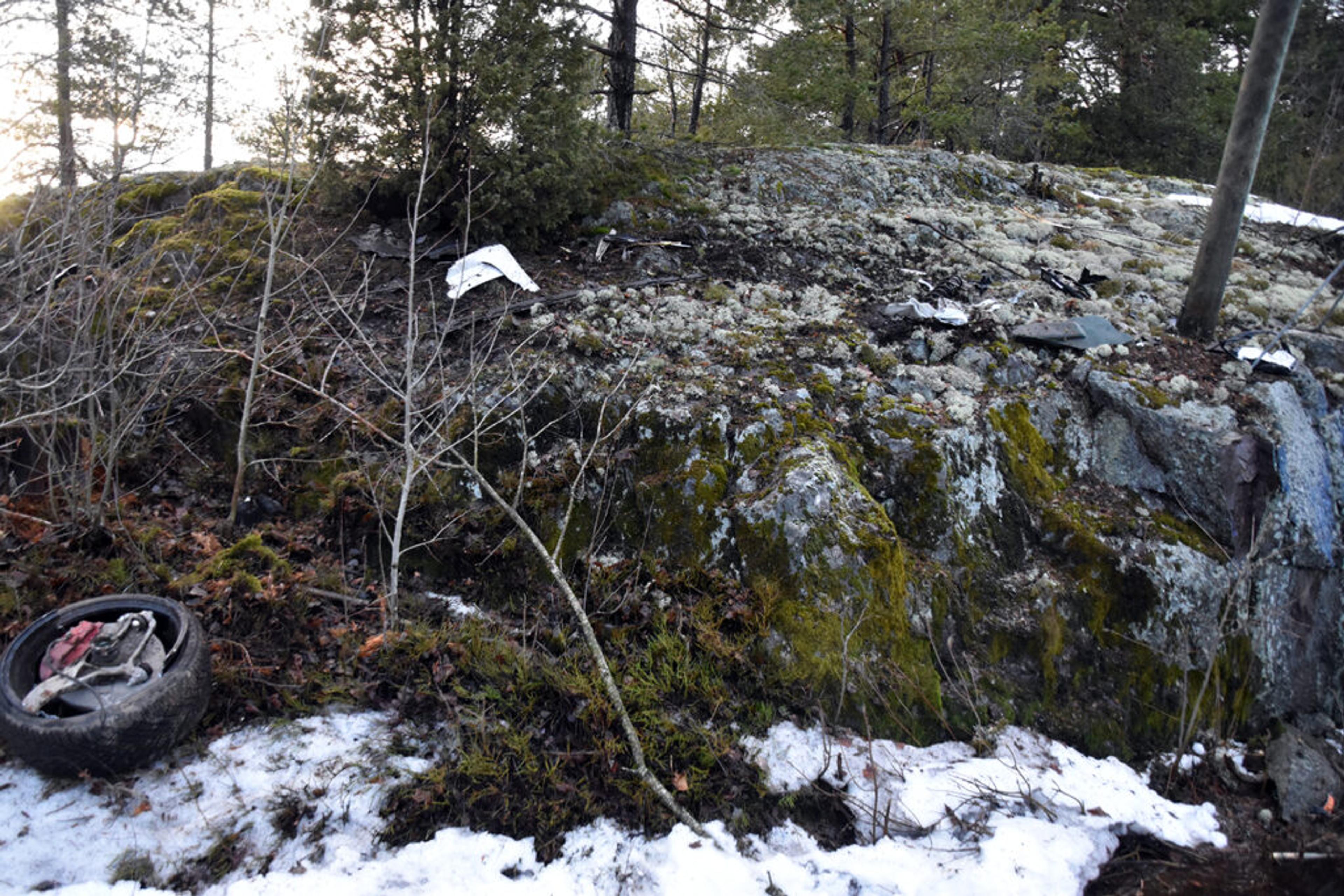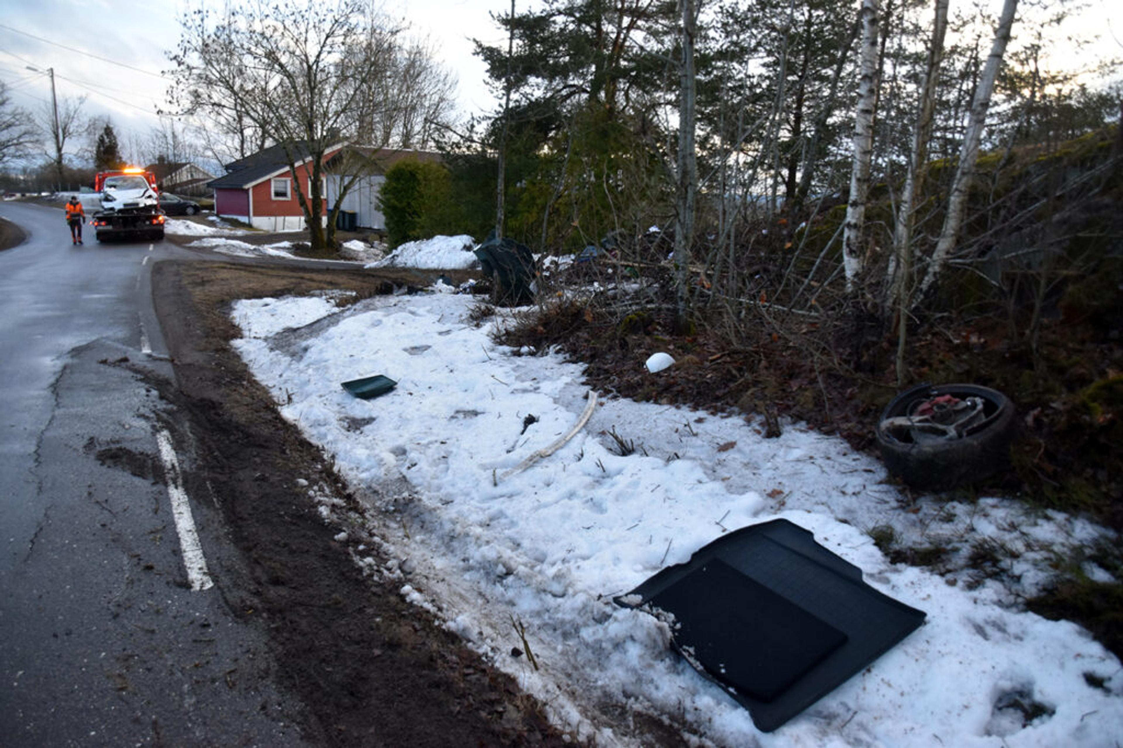 VRAKDELER: Det er tydelig å se hvor bilens ferd har gått, til langt oppå fjellrabben før den rulla ned på veien igjen. Foto: Stian Ormestad, ReAvisa.
