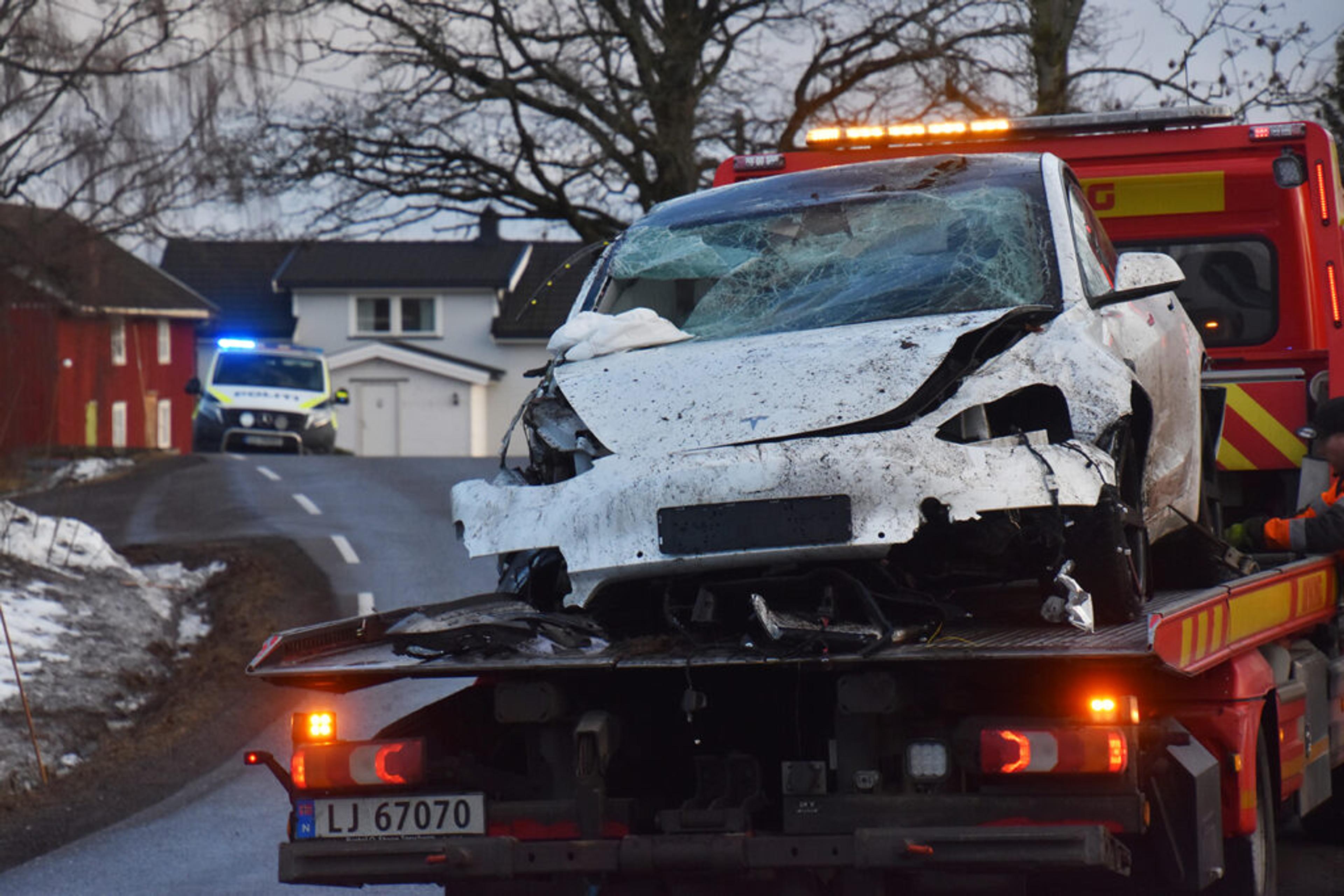 BILBERGING: Bilen er totalvrak etter en voldsom utforkjøring. Foto: Stian Ormestad, ReAvisa.