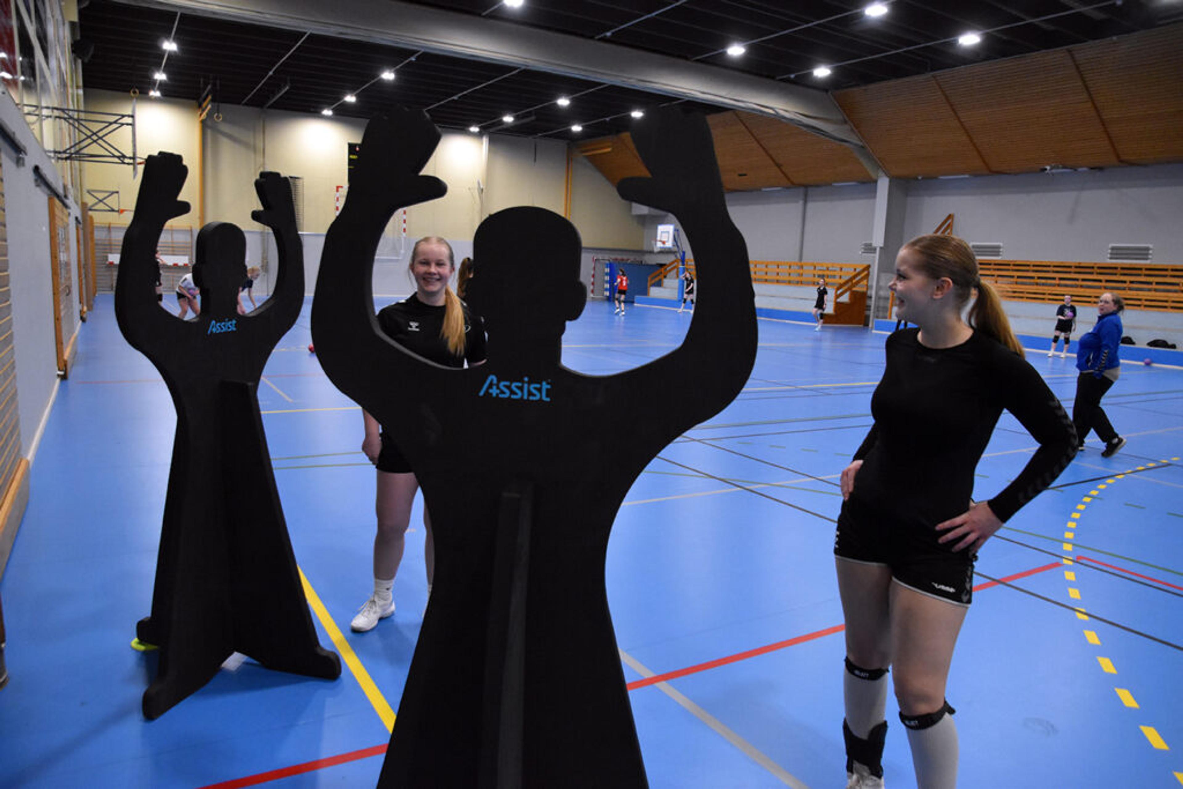 FORSVARERE I ISOPOR: Disse to sparringspartnerne har fått navnene Bertram og Kåre, kalt opp etter to gutter jentene møtte på en tidligere håndballcup. De er kjekke å ha, så alle kan trene på å skyte uten at noen må stå i forsvar. Foto: Stian Ormestad, ReAvisa.