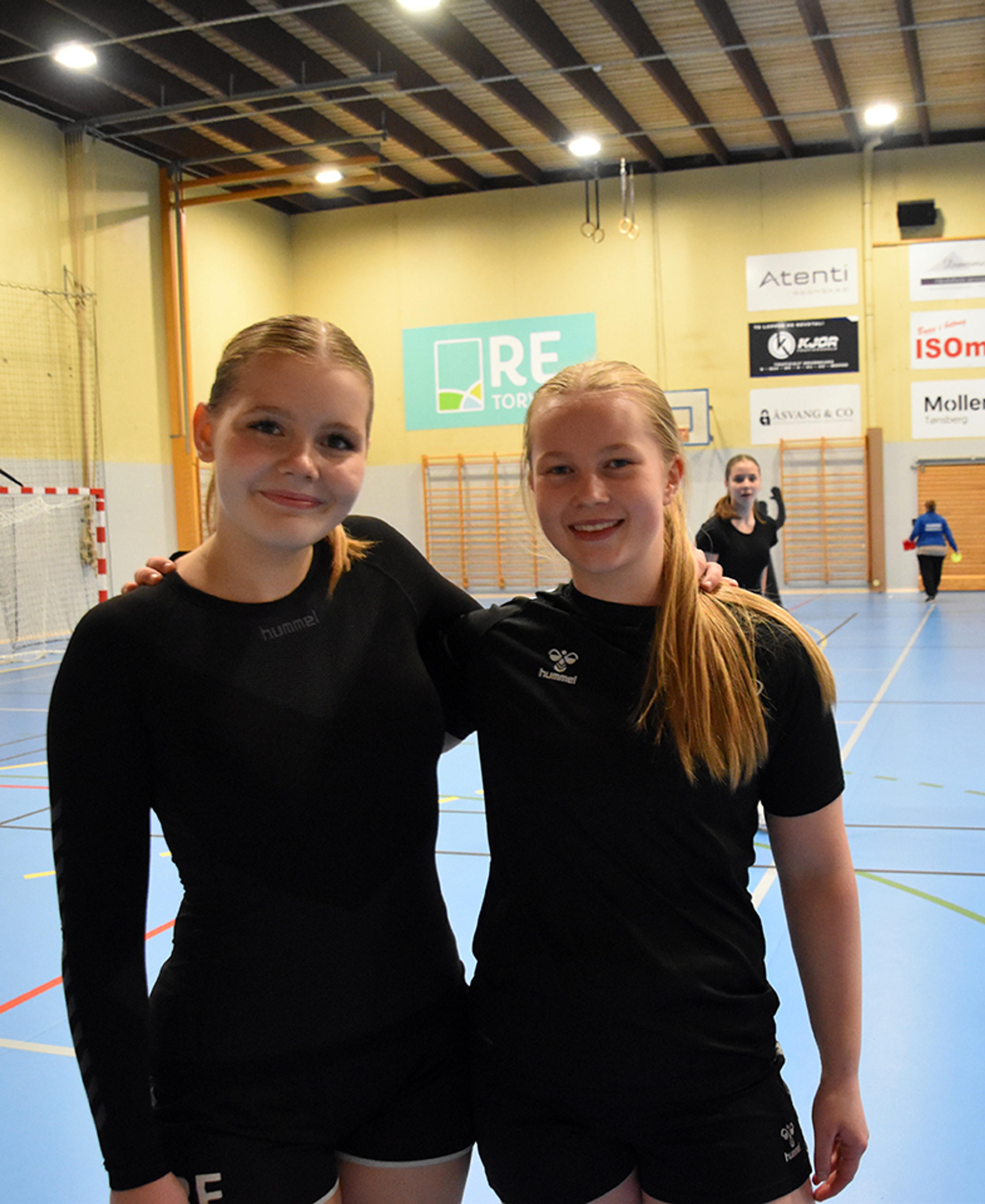 SESONGAVSLUTNING: Ragnhild Rivrud Jevanord (13) og Nora Jensen Linnestad (15) lader opp til håndball dag ut og dag inn, med både Slottsfjellcup til helga og A-sluttspill onsdag til uka. Foto: Stian Ormestad, ReAvisa.