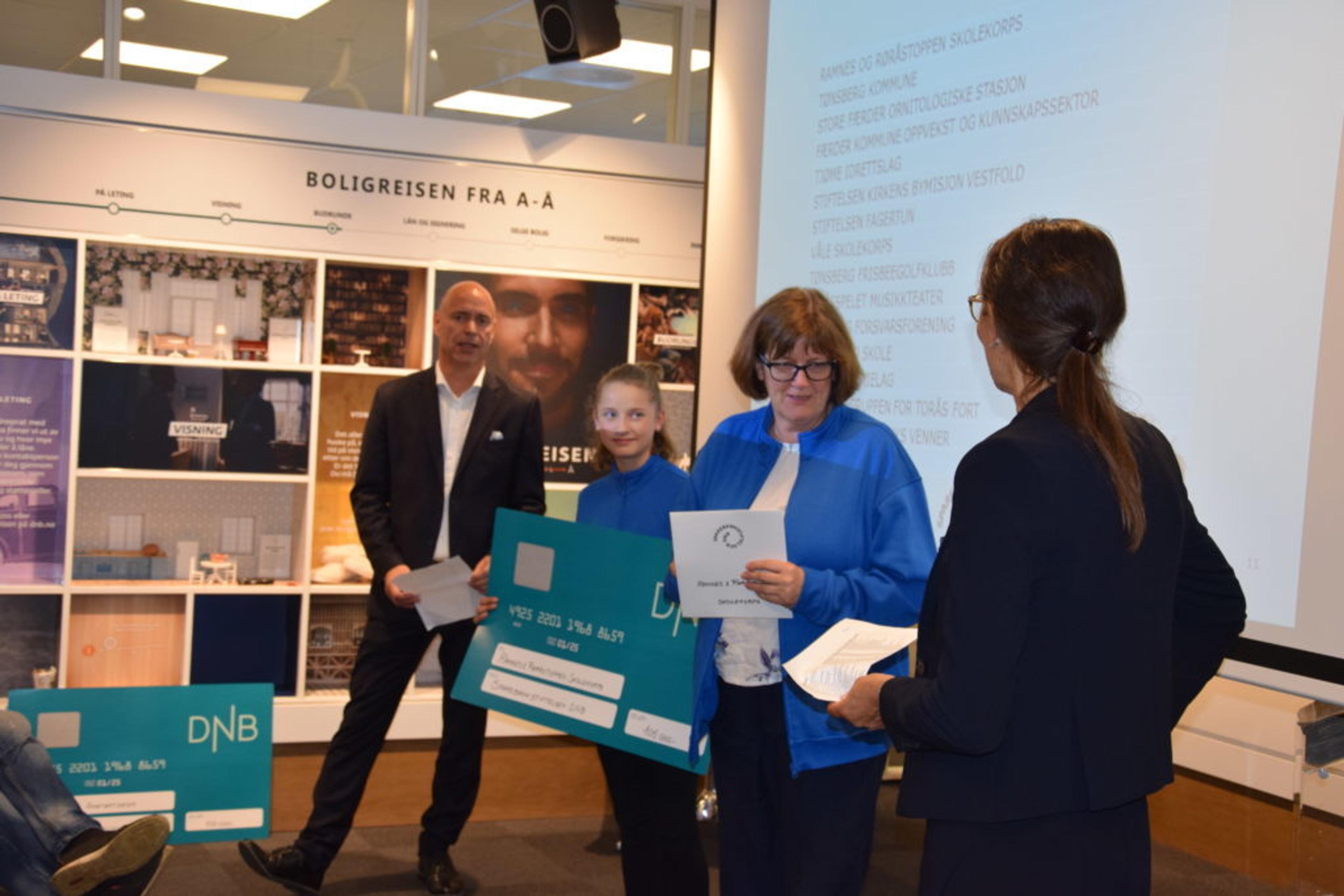 SKOLEKORPS: Våle skolekorps får 200.000 kroner. Fra venstre Terje Solvik, DNB, Marianne Pedersen, Våle Skolekorps, og Hanna K. Aronsen, DNB. Foto: Håkon Westby.
