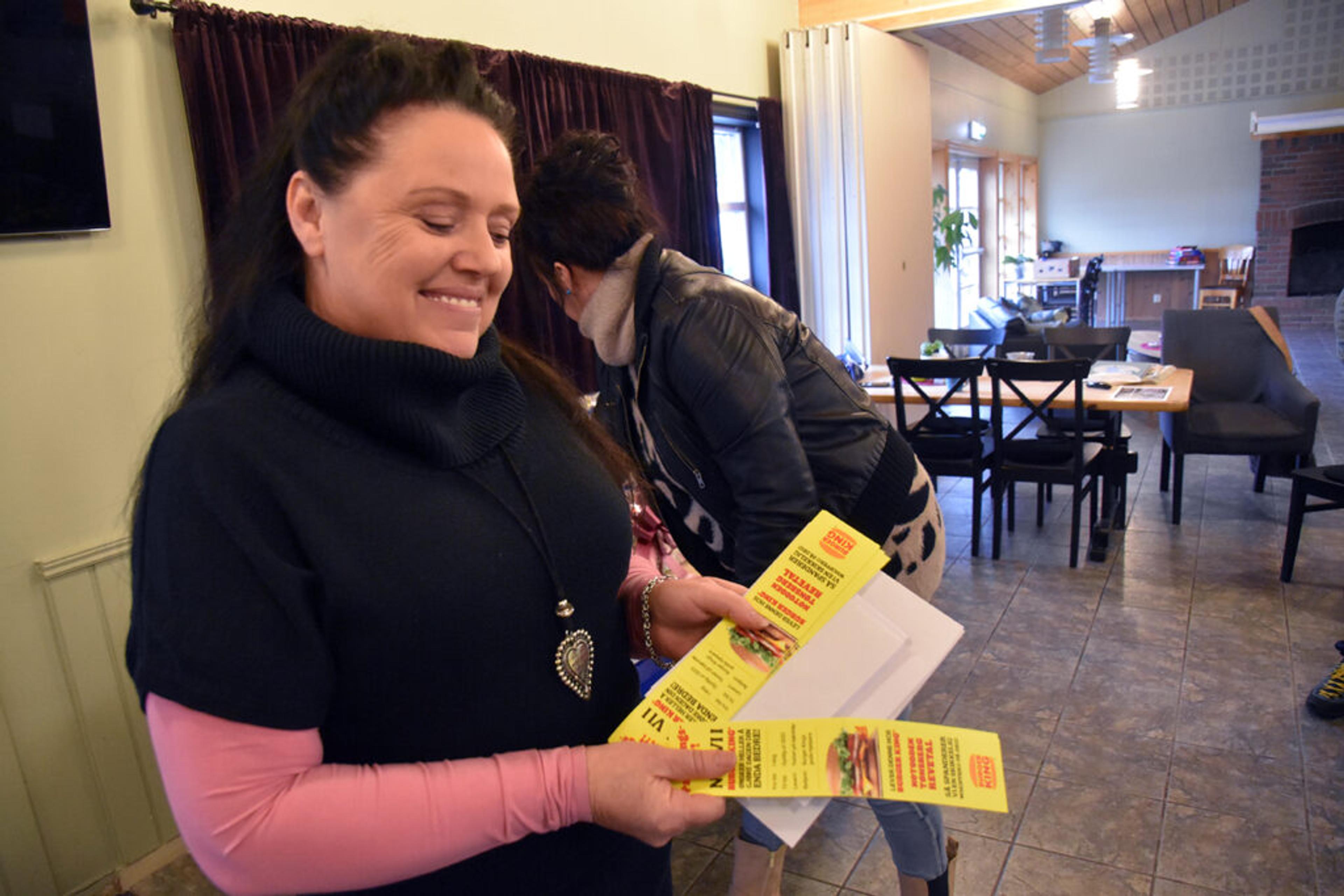 NYTTIGE PREMIER: Kari Giil viser fram noe av det som skal loddes ut av gavekort og gratiskuponger – alt fra bilvask til burger til hele familien. Noen Re-bedrifter har gitt gaver verdt flere tusen. Foto: Stian Ormestad, ReAvisa.
