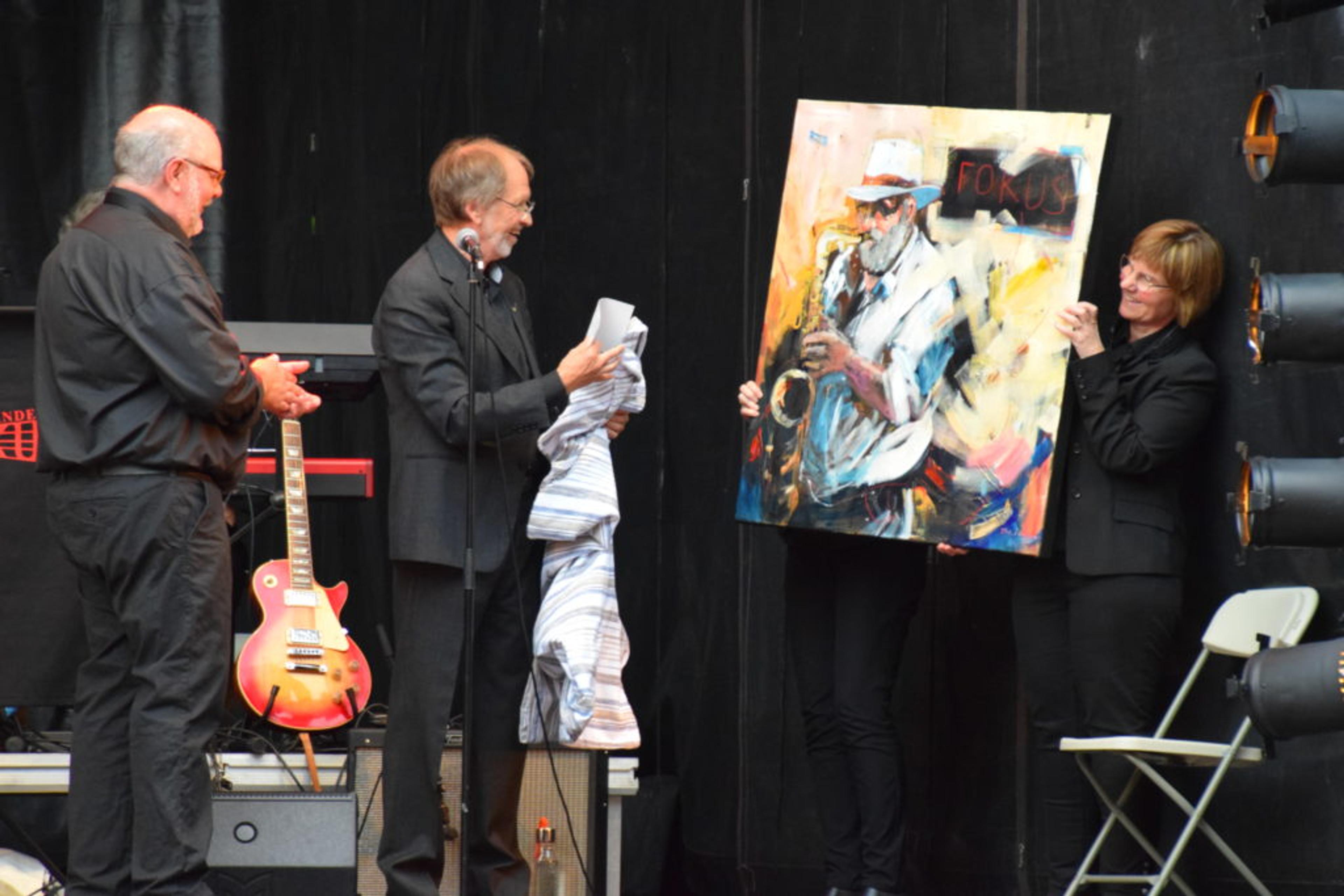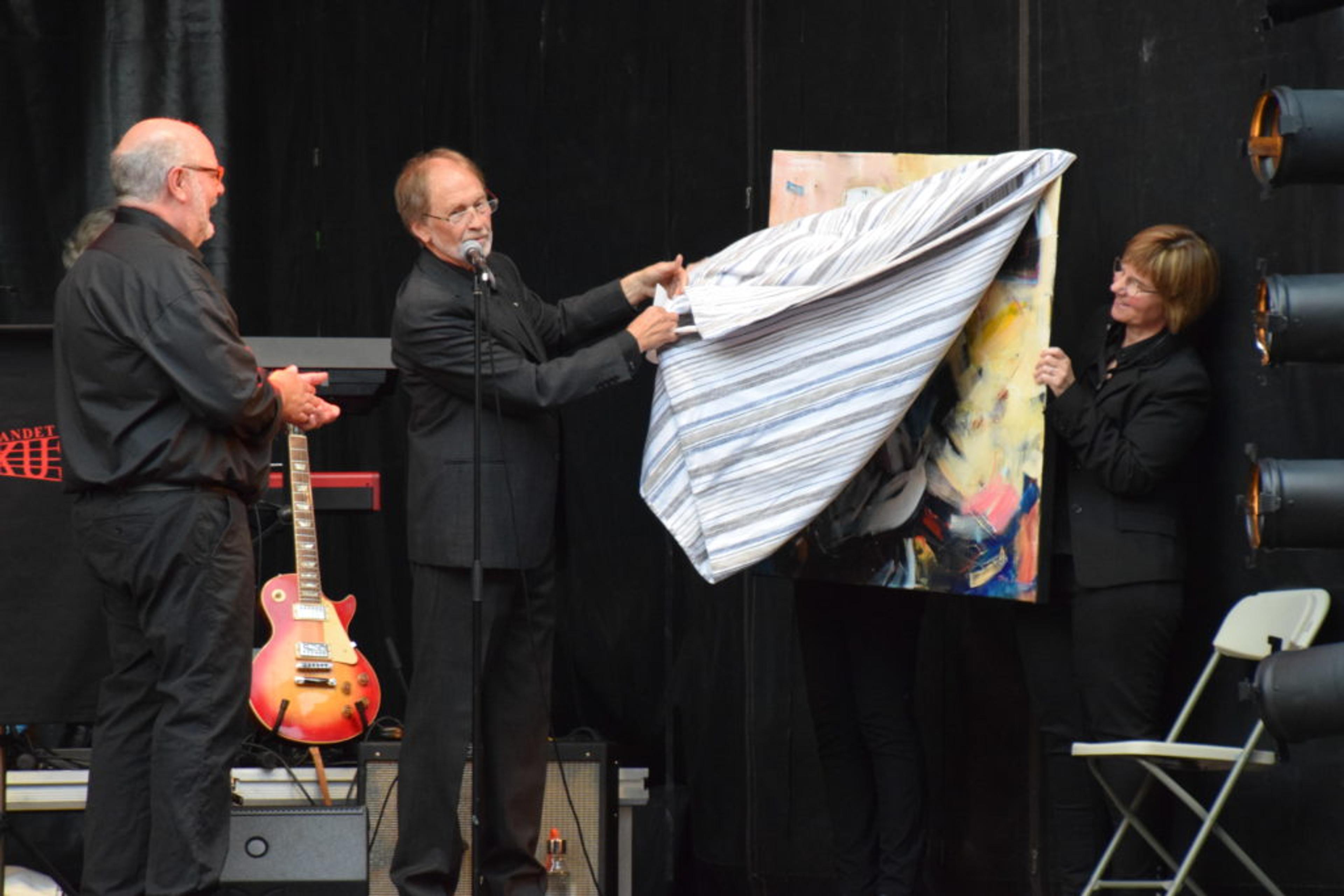 Et flott maleri av Stein Smaaskjær ble avduket til et gisp fra salen og et stort smil fra hovedpersonen – og motivet på maleriet – sjøl.