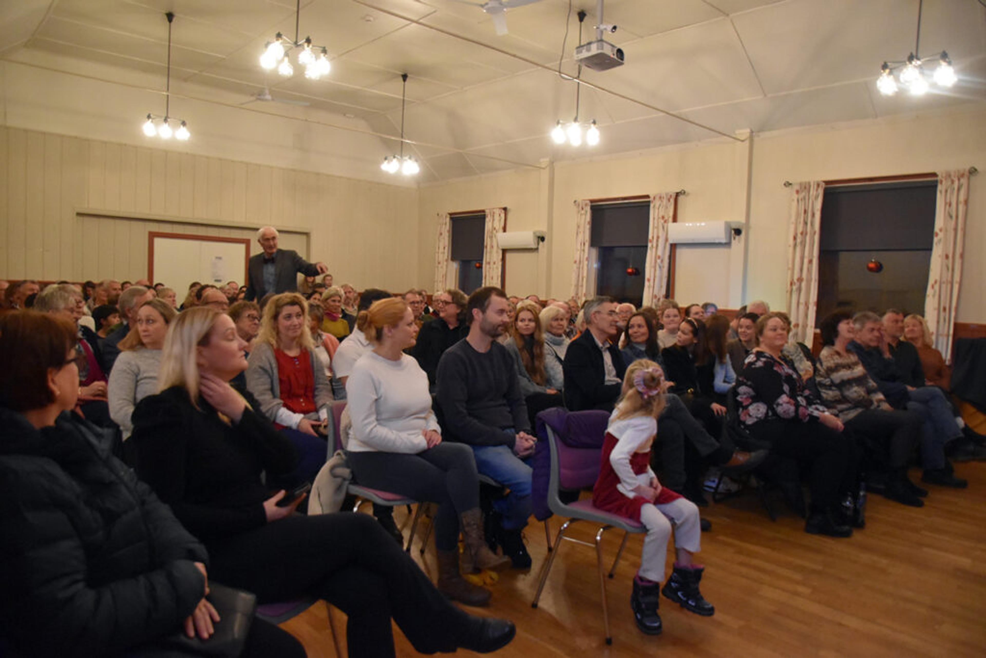 FØR KONSERTSTART: Den levende lokalkulturlegenden Knut Høydal drar i gang allsang med publikum og artister som utgjør et mektig bygdekor på 200 mennesker før første innslag for Nyttårskonserten 2023. Foto: Stian Ormestad, ReAvisa.