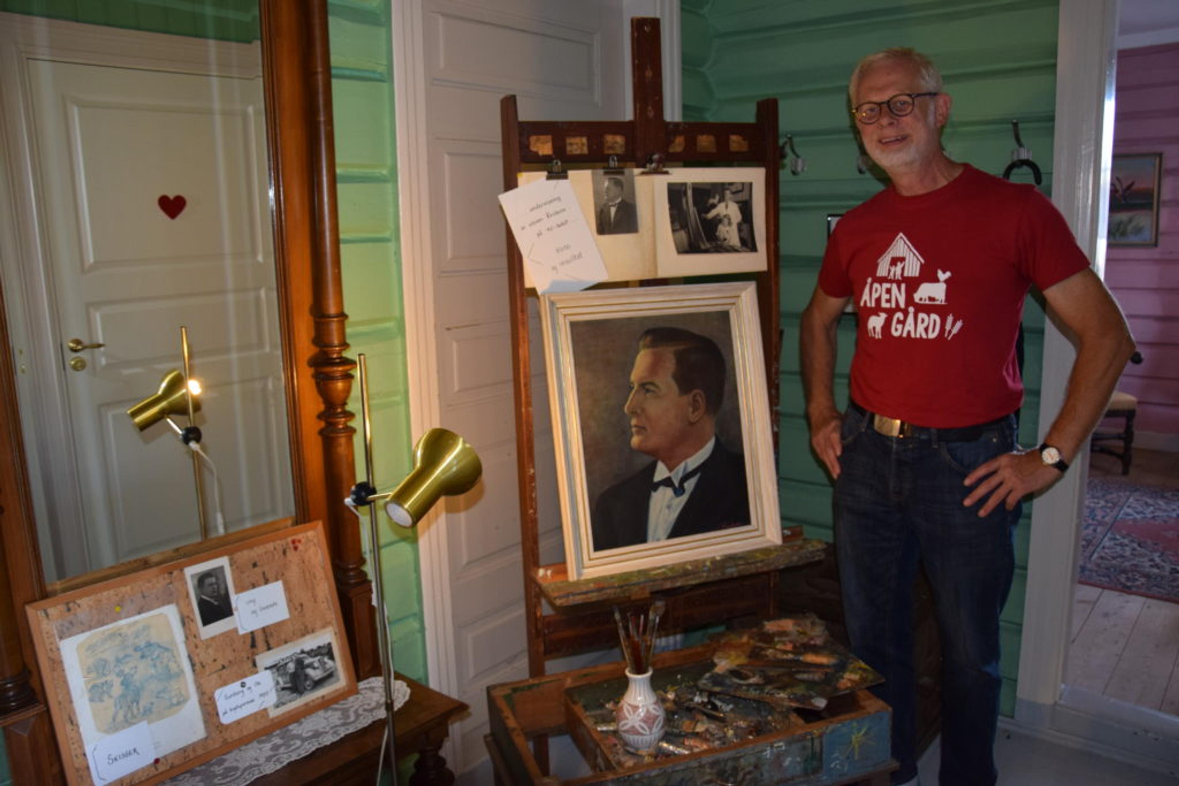 MALERIER: Ole Sjuves malerier er utstilt i stuene. Kåre Holtung viser fram et portrett av Ole Sjuve. Foto: Håkon Westby.