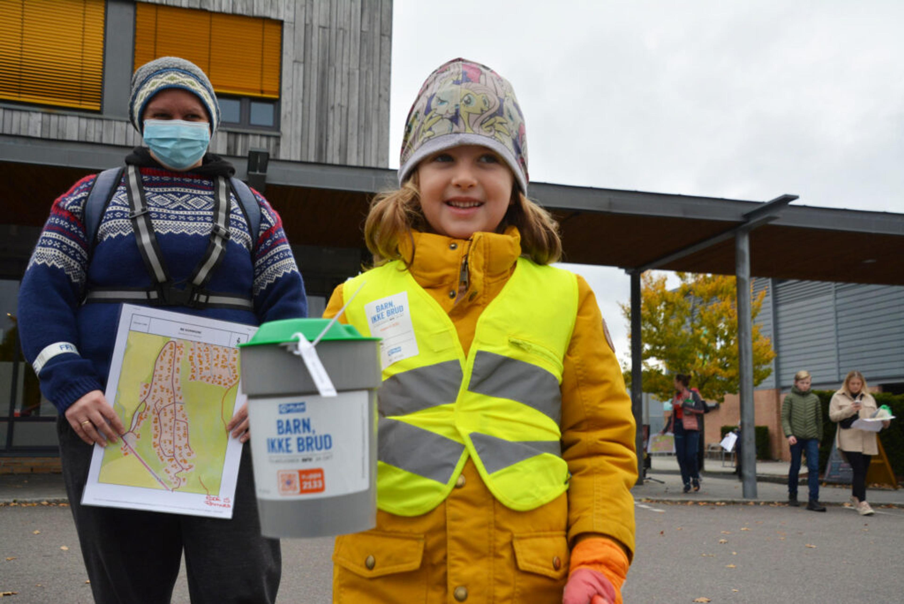 UT PÅ TUR: Natalie (6) og mamma Linda (34) har fått favorittruta si, hjemme i Valleåsen. Den ruta har de gått før, ikke med bøsse – men med lapper om dugnad i vellet. Foto: Stian Ormestad.