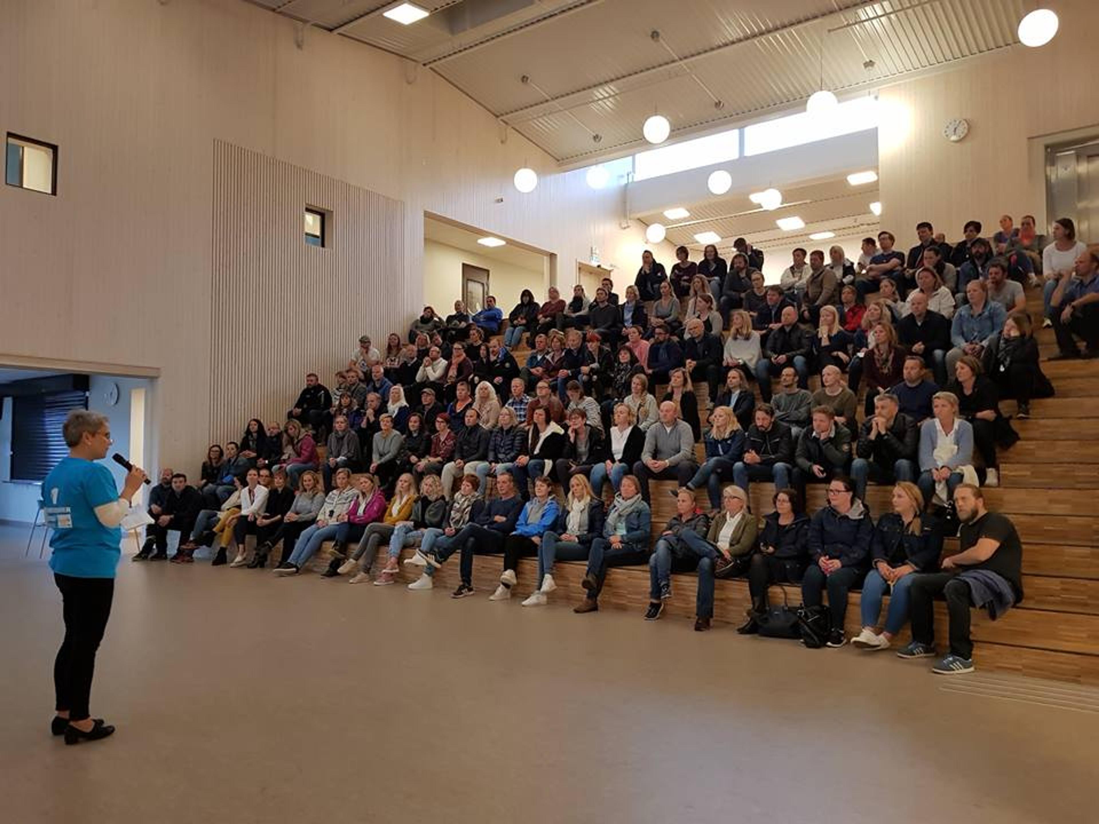 BØSSEBÆRERE: Hovedutvalgsleder Tove Øygarden informerer her 8. klassingene ved Revetal ungdomsskole om årets TV-aksjon. Hvert år går 8. klassingene med bøsser. Foto: Re kommune.