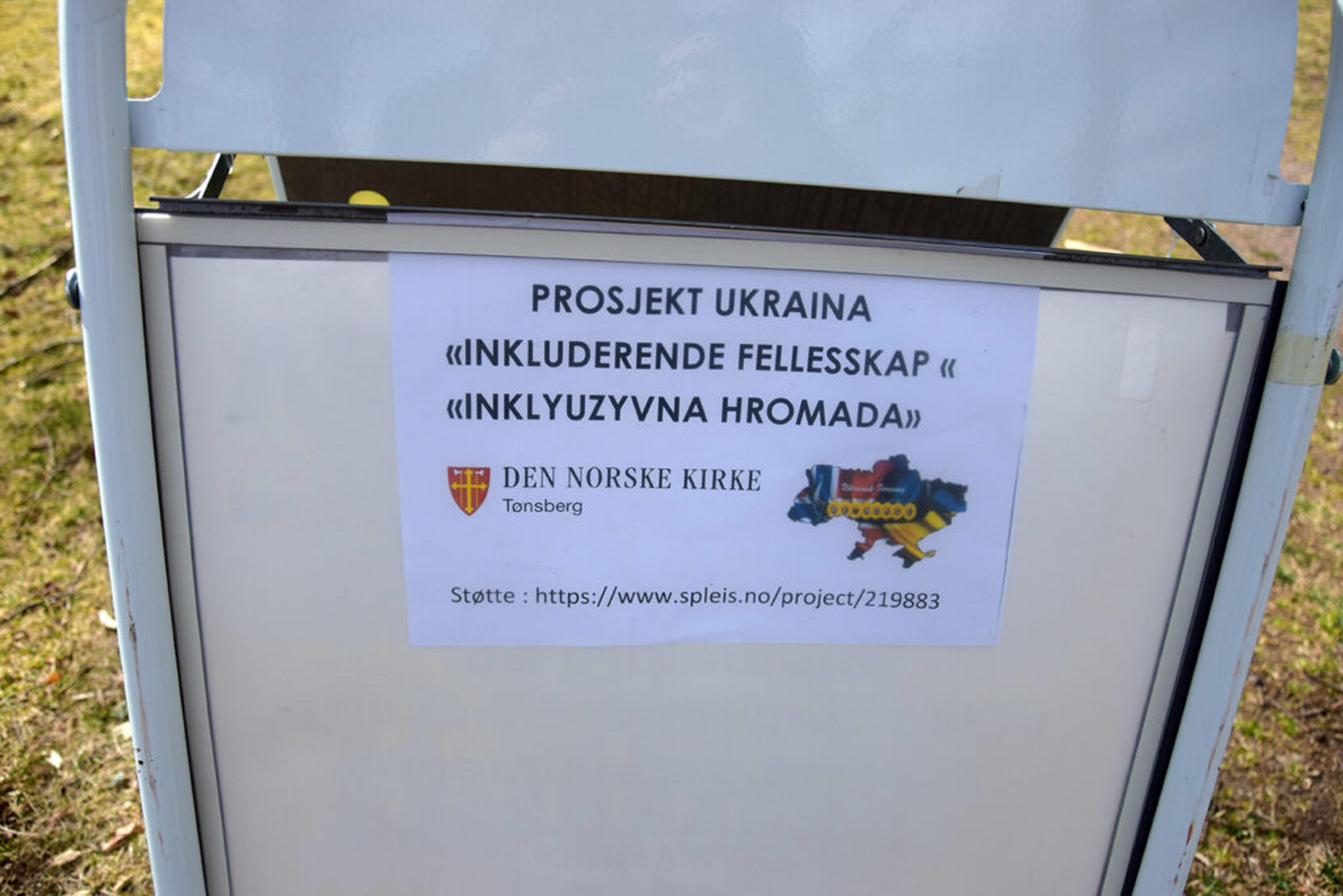 INKLUDERENDE FELLESSKAP: Mottoet for feiringa i Re, som samla ukrainere fra hele Tunsberg bispedømme på Våle menighetshus søndag 24. april 2022. Foto: Håkon Westby.