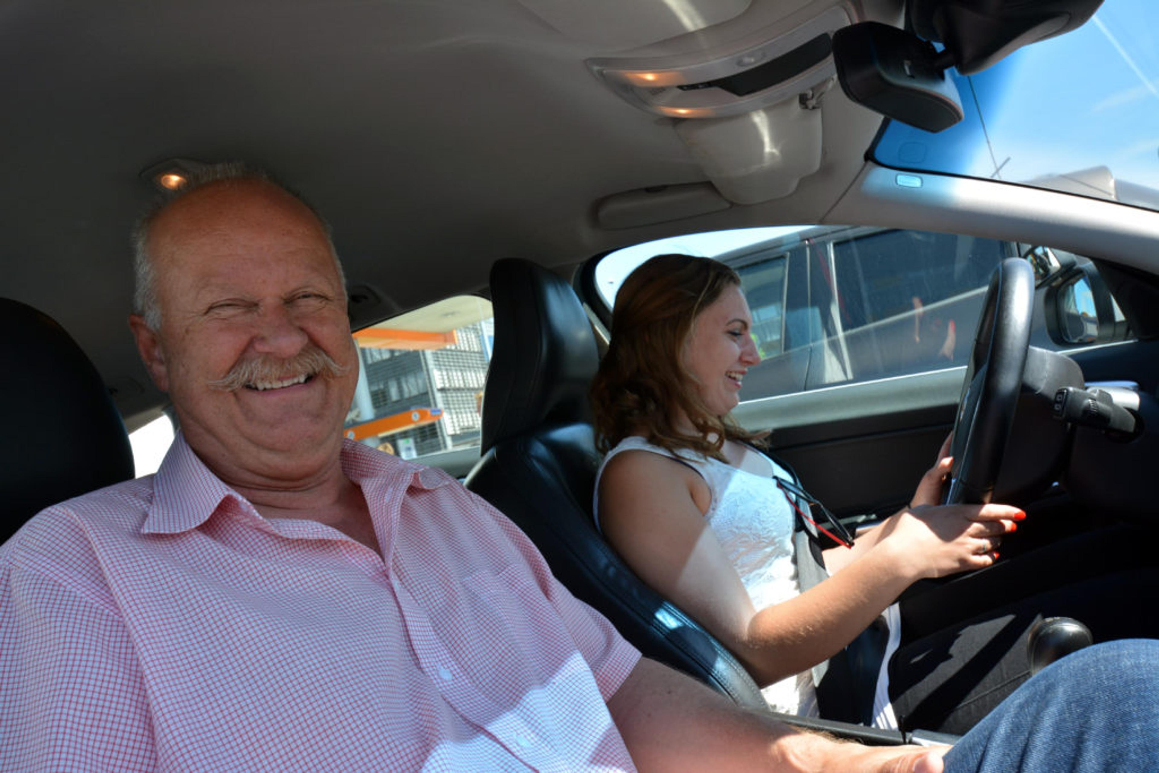 GODT HUMØR: Ulf Arne Lauridsen (66) har trivdes veldig godt som kjørelærer i over 40 år. Her under opplæring av en elev for noen år siden. Foto: Stian Ormestad.