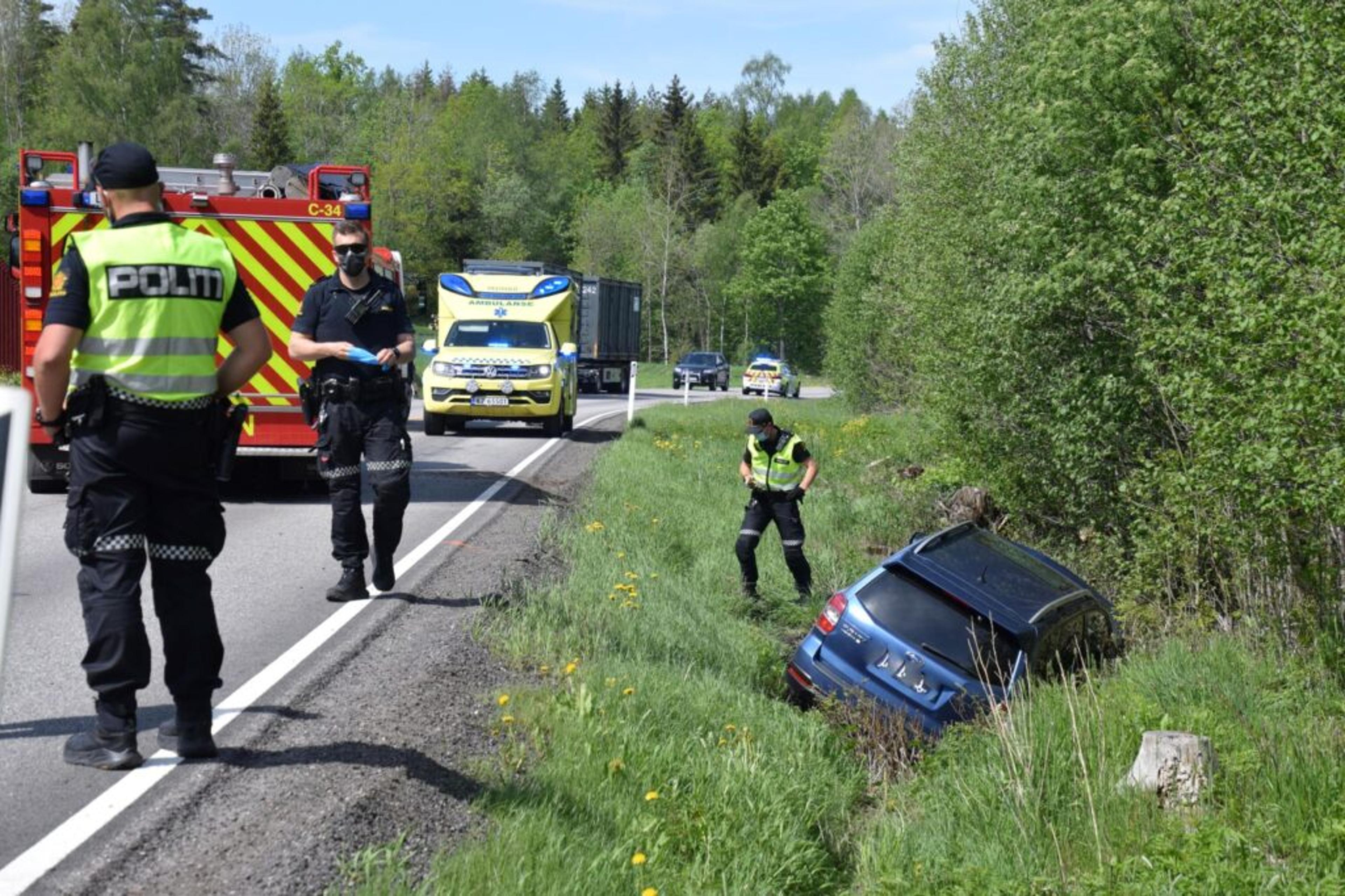 Klokka 14.00 har alle nødetater parkert ute av veien og trafikken passerer som normalt. Det må påberegnes ny dirigering ved berging av bilen.