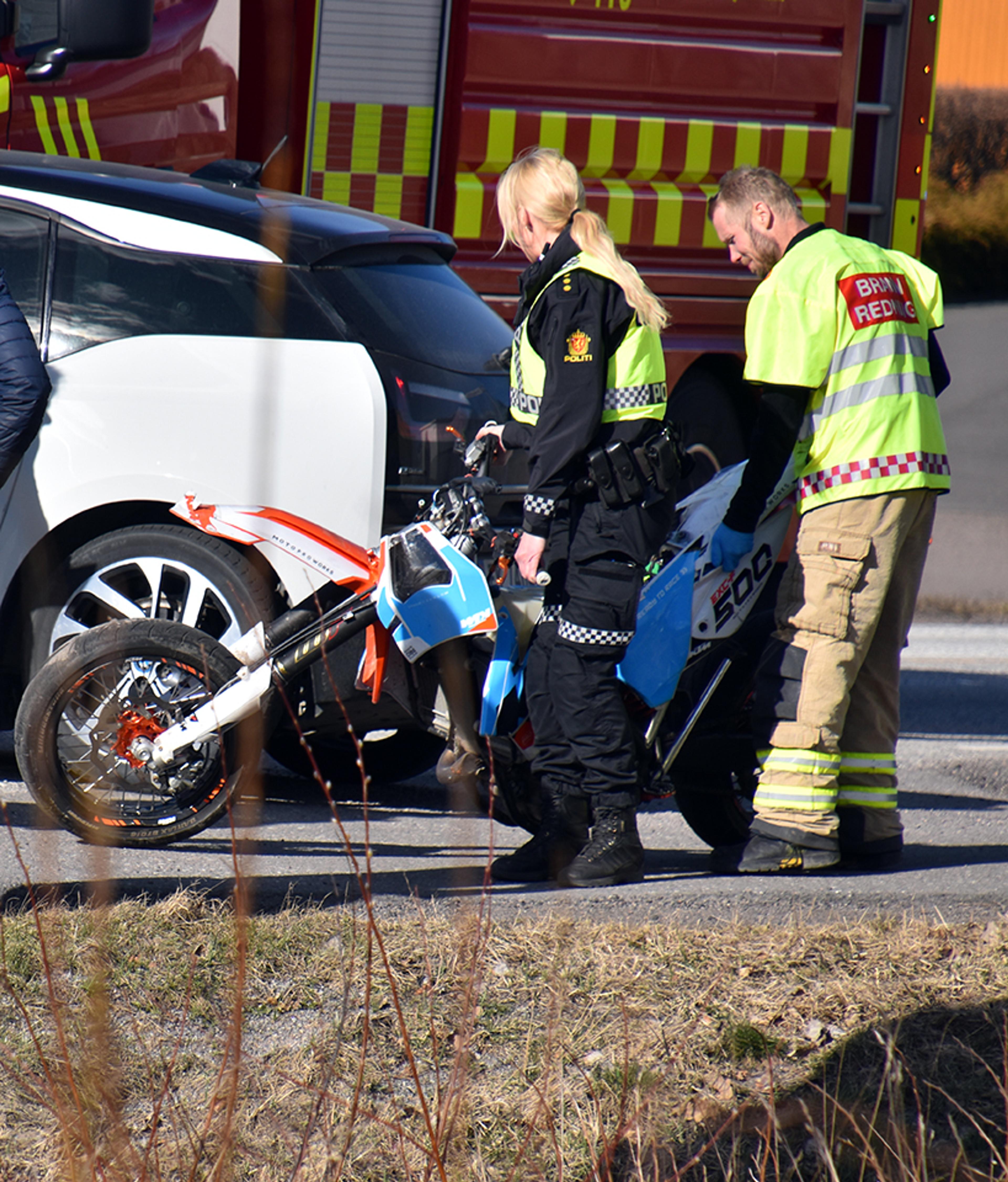 – Melding om trafikkulykke. Bil og MC involvert. Nødetatene rykker til stedet, melder Politiet i Sør-Øst klokka 16.01 fredag 8. april 2022: