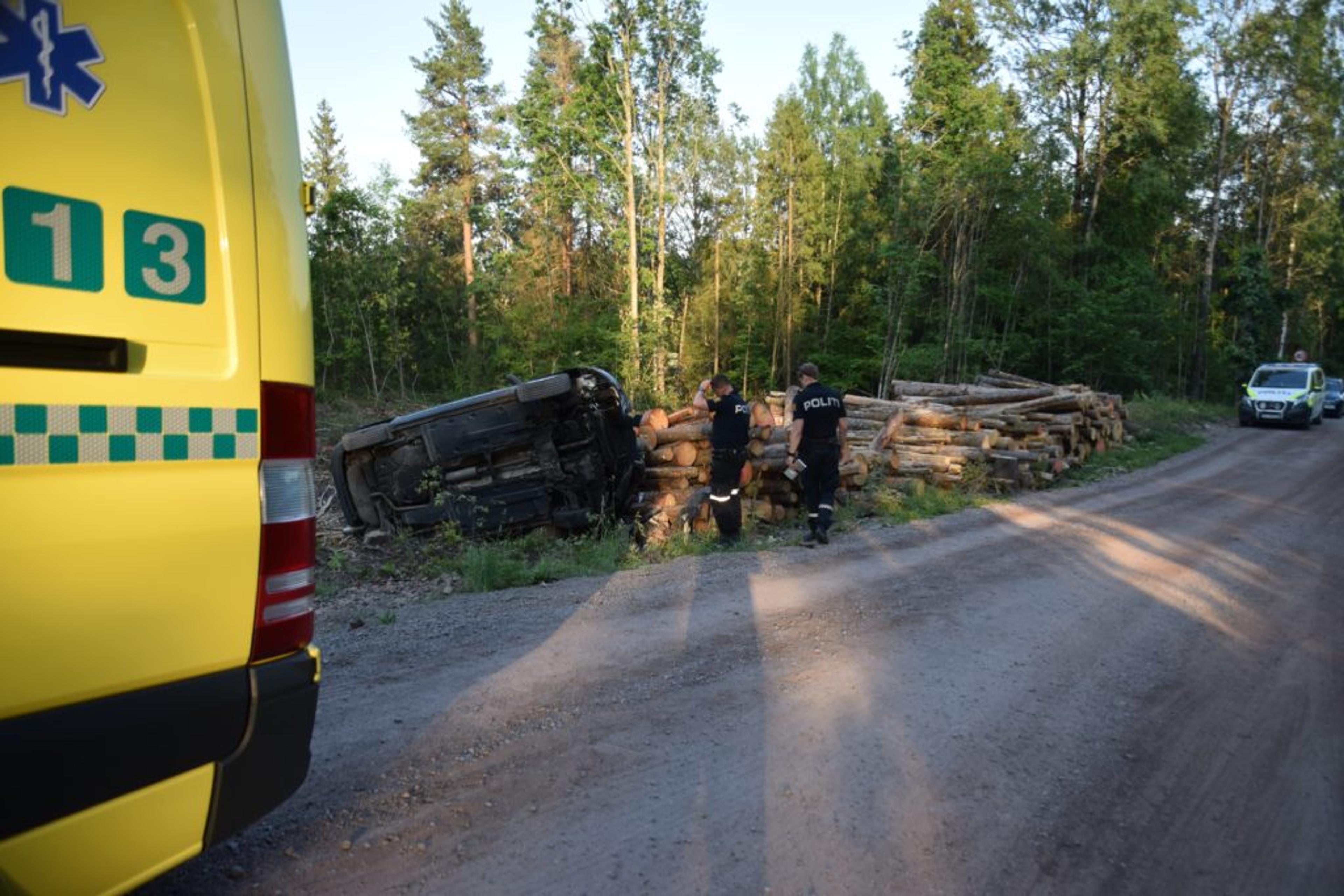 Trafikken går i skrivende stund som normalt forbi, ulykkesbilen ligger godt uttafor veien.