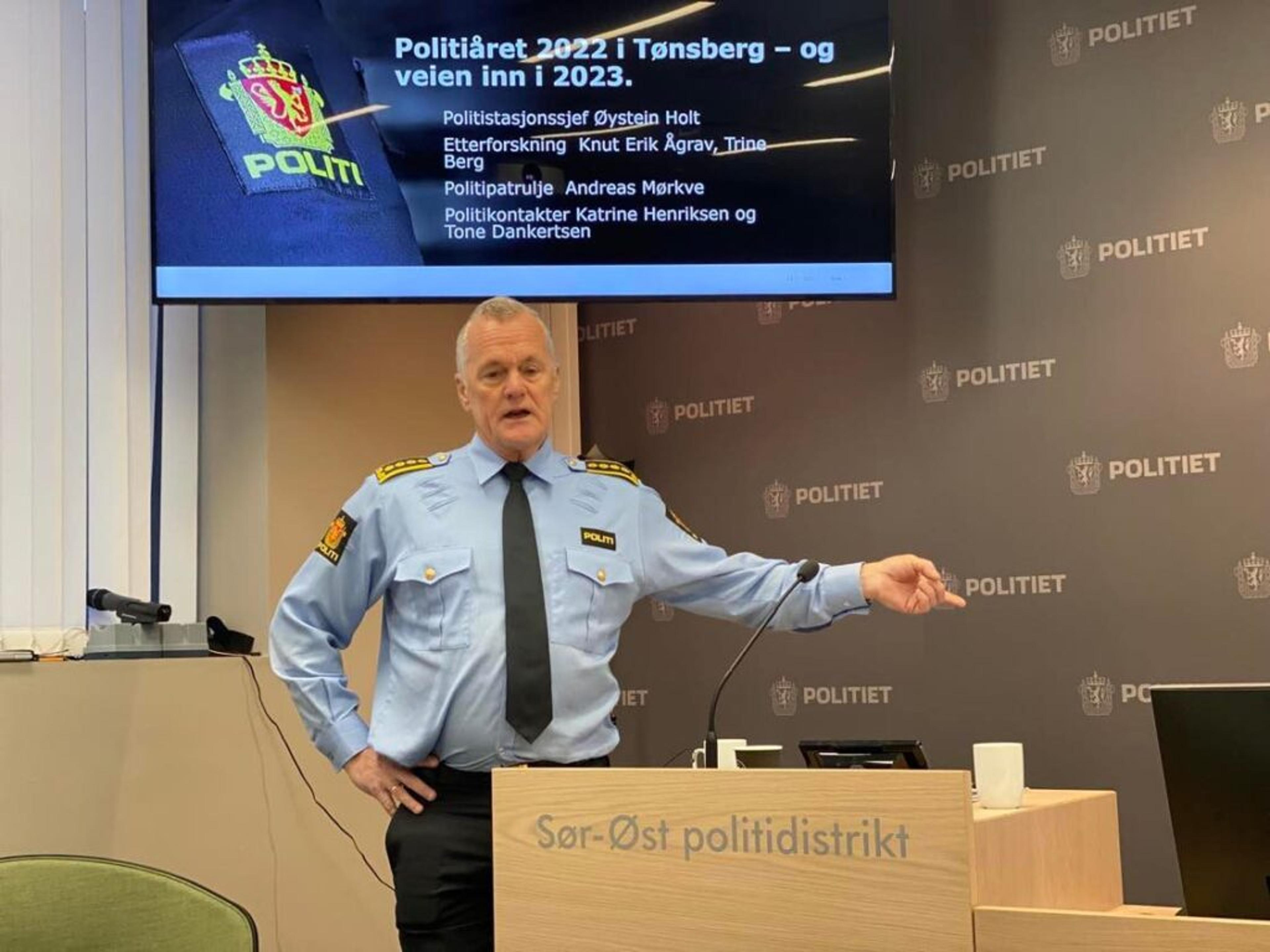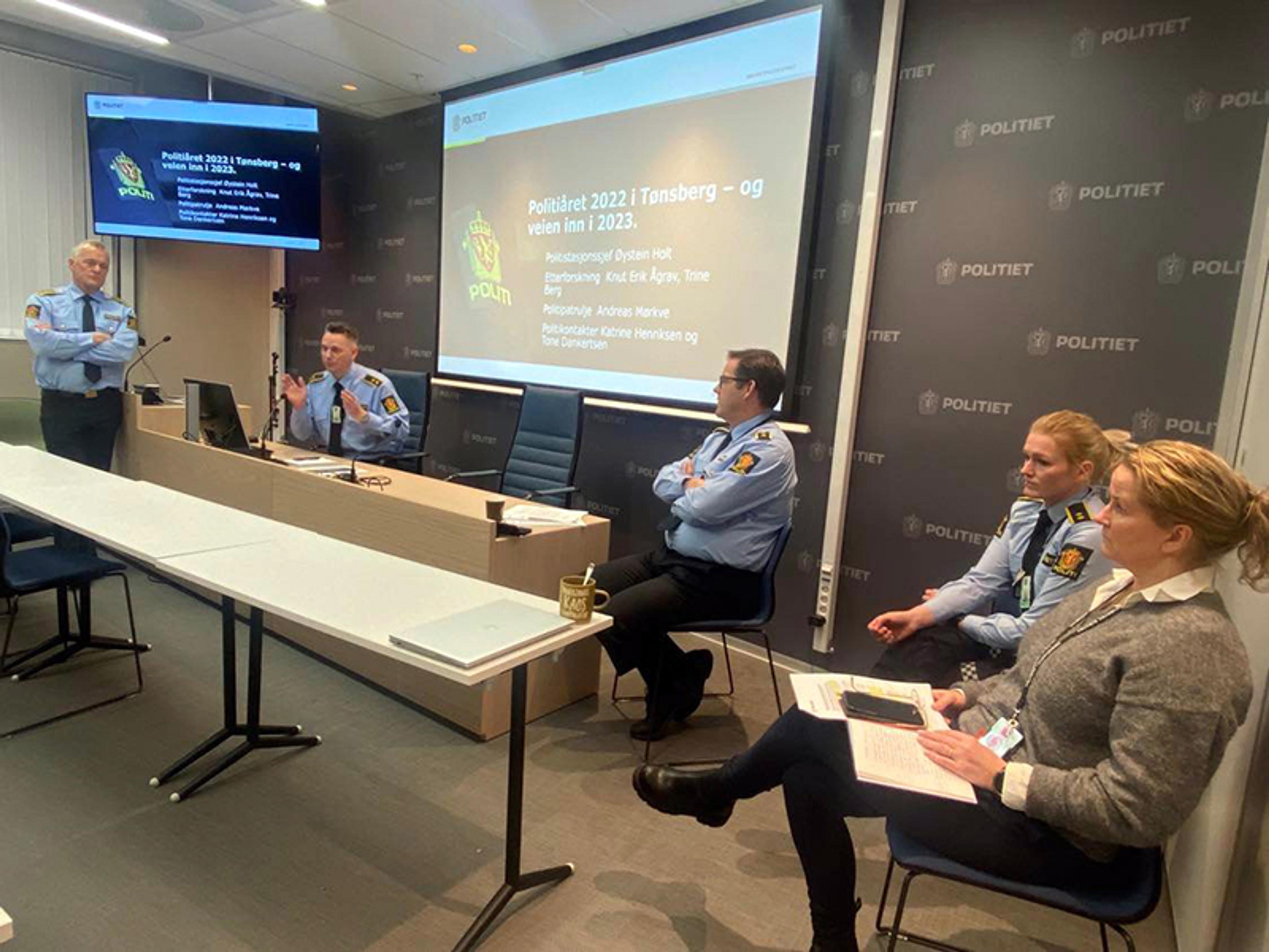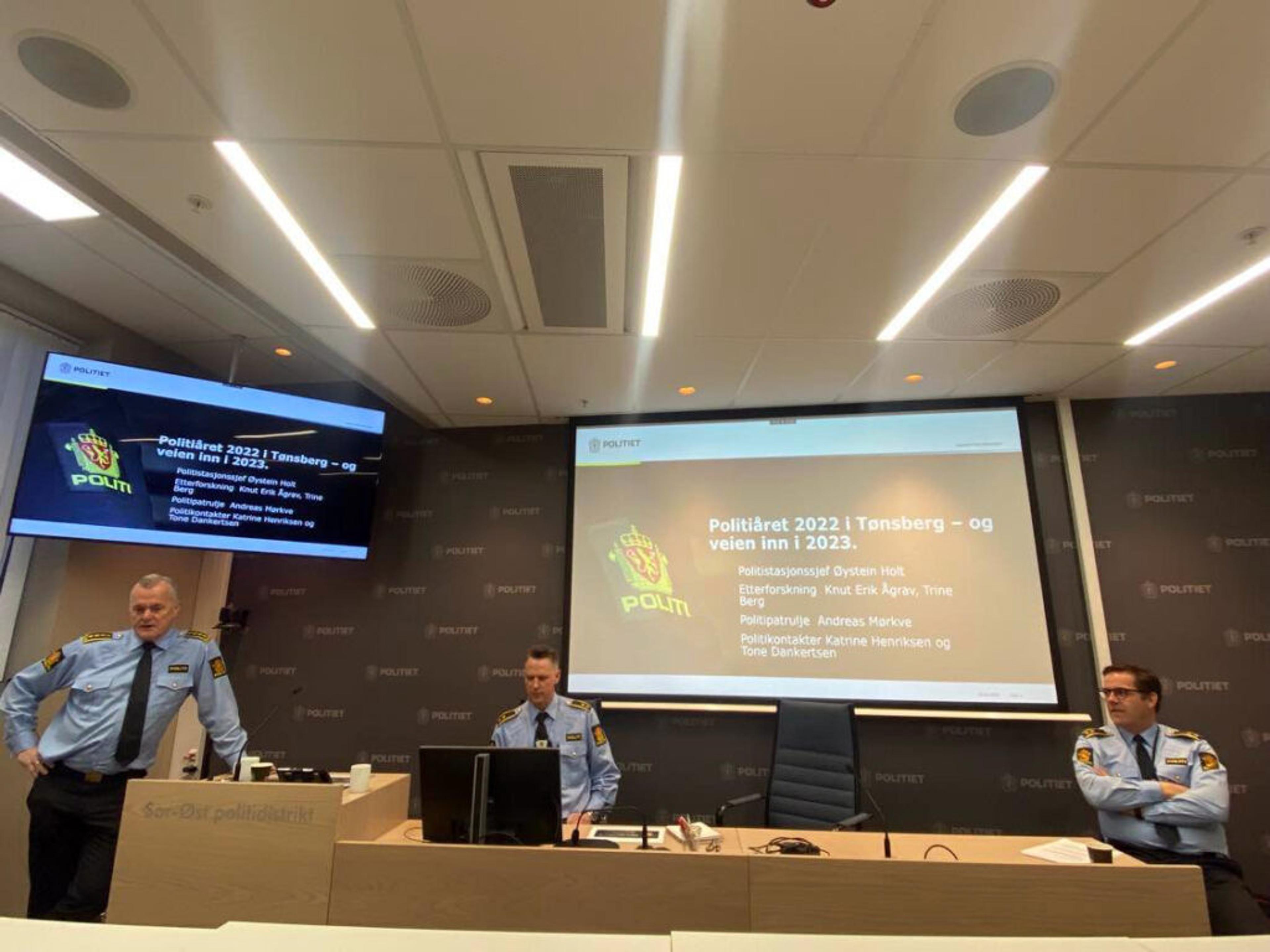 TØNSBERG POLITISTASJON: Politiåret 2022 ble oppsummert, og antatte utfordringer for 2023 ble presentert. Der er et ungdomsmiljø med vold- og narkotika-utfordringer et punkt. Foto: Stian Ormestad, ReAvisa.