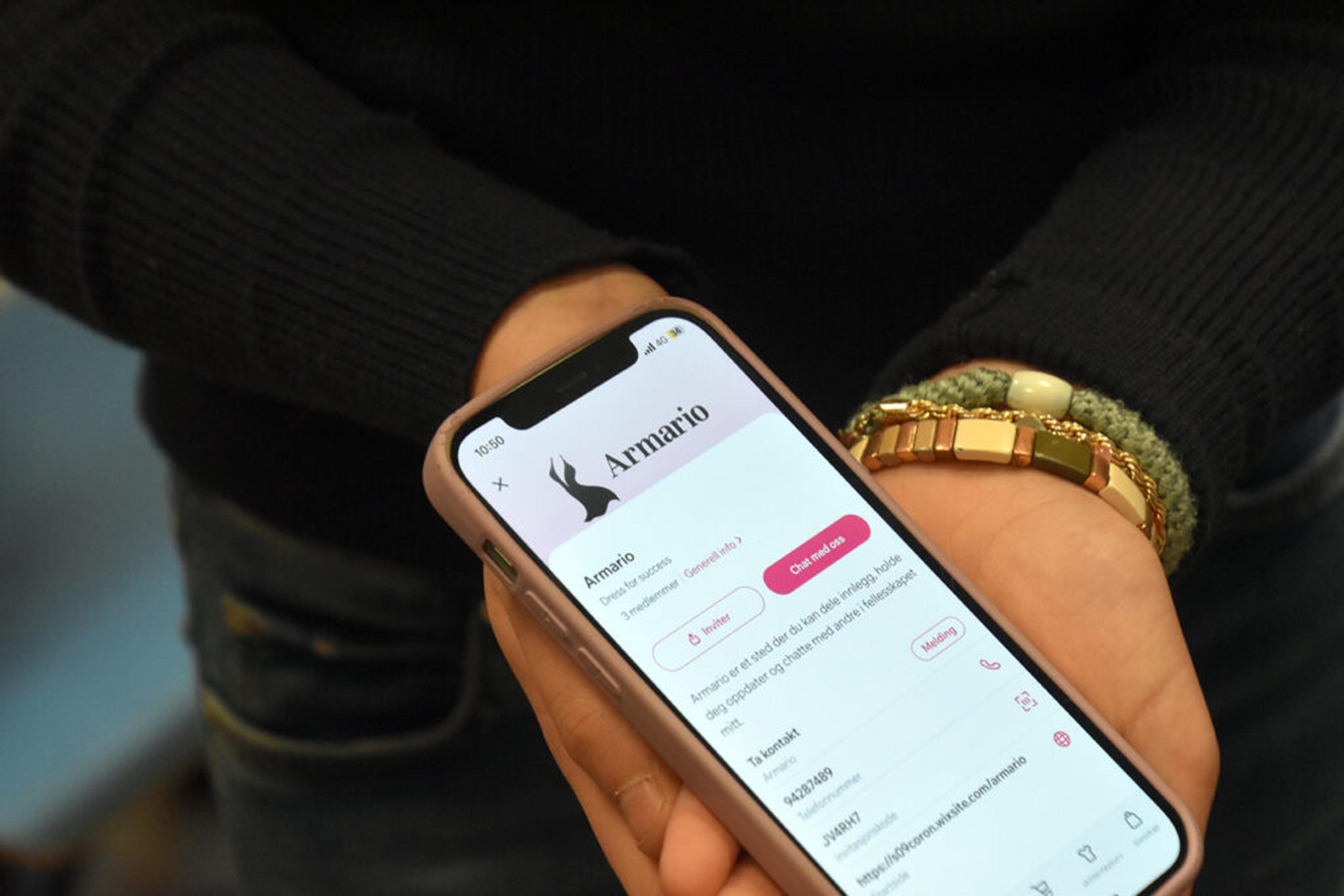 APP: Ideen er en tjeneste som blant annet matcher klærne dine for deg. Du kan legge inn hverdag, fest, galla og rød løper, eller annet – og appen kan sette opp forslag til outfit for deg. Til og med en app hadde gruppa fått på plass, som de viste fram. Flott design og utførelse. Foto: Stian Ormestad, ReAvisa.