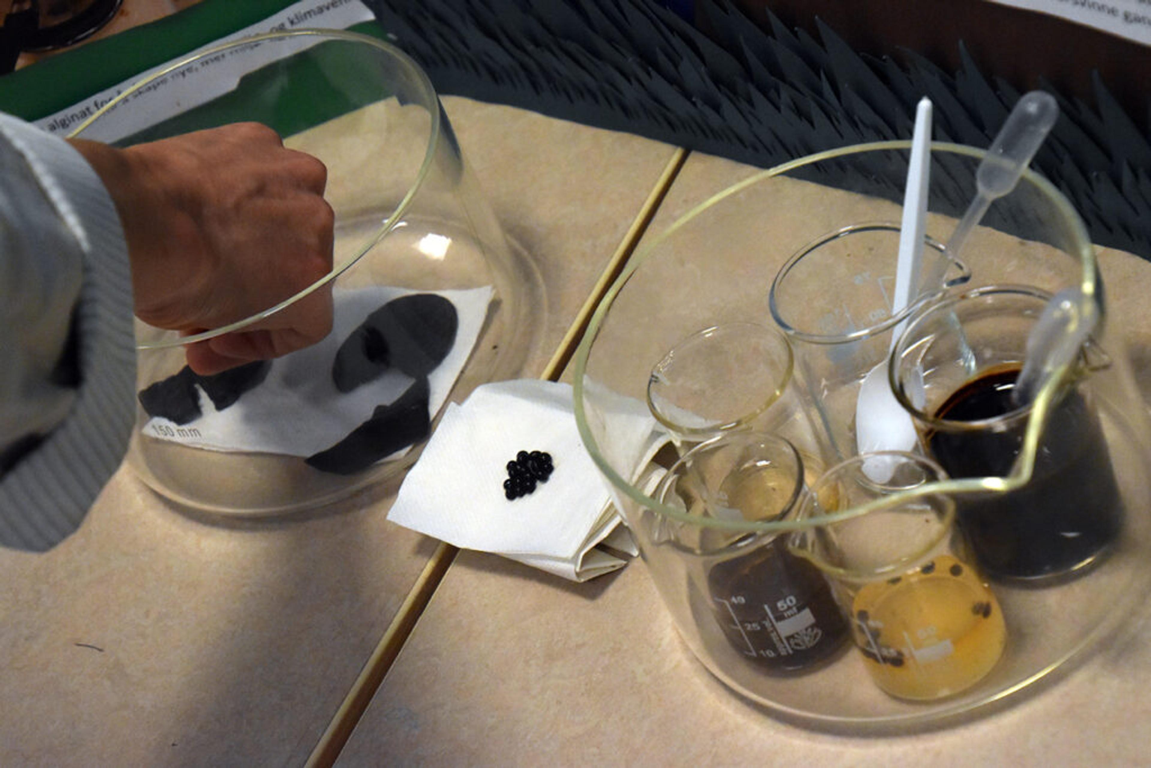 SPENNENDE: Å utvikle plast og plastposer fra tang og tare var ideen til gruppa bak «Browntide»-prosjektet, der de langt på vei hadde klart å gjøre det sjøl på fysikksalen. – Disse har fulgt med i timen, uttalte et imponert jurymedlem. Foto: Stian Ormestad, ReAvisa.