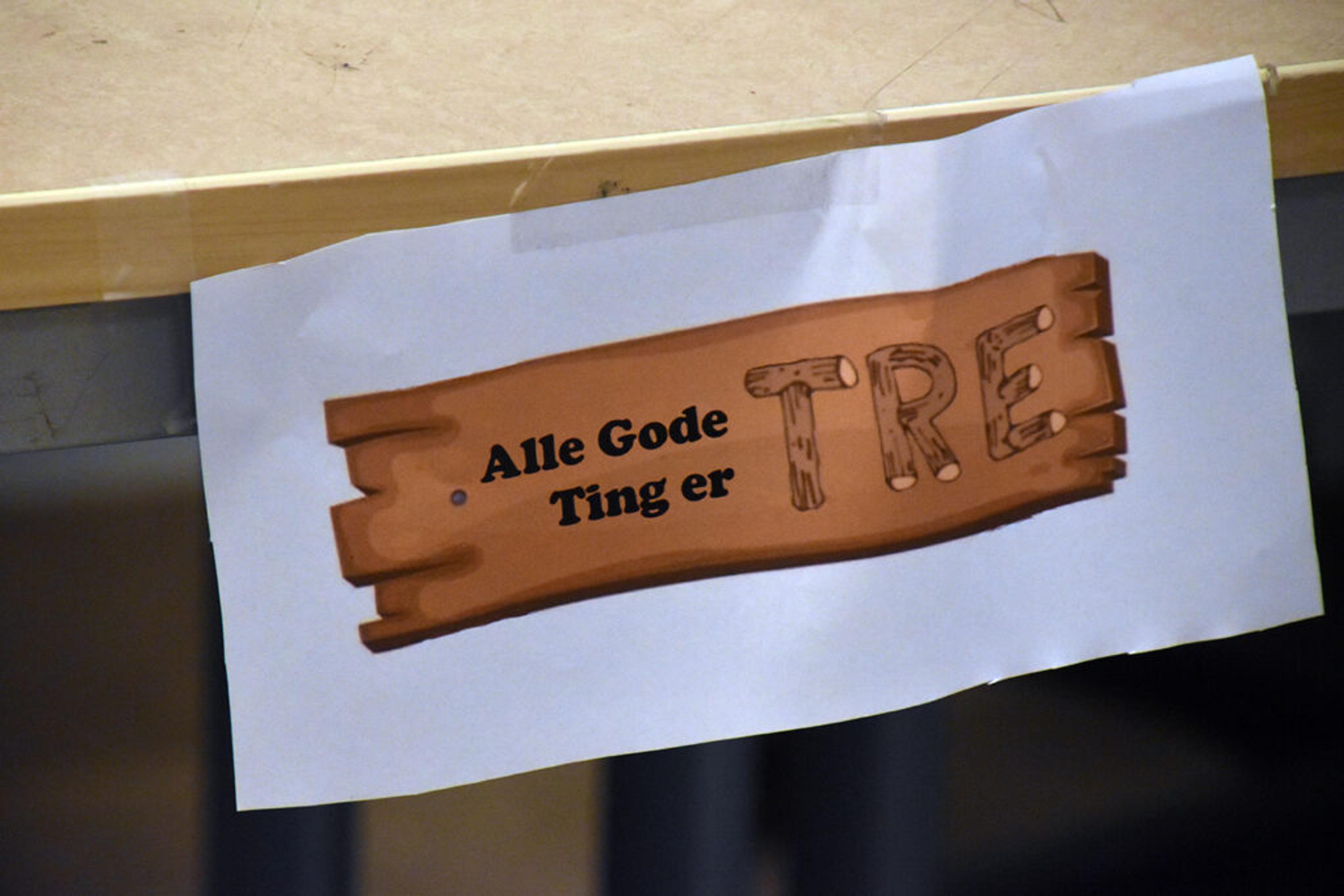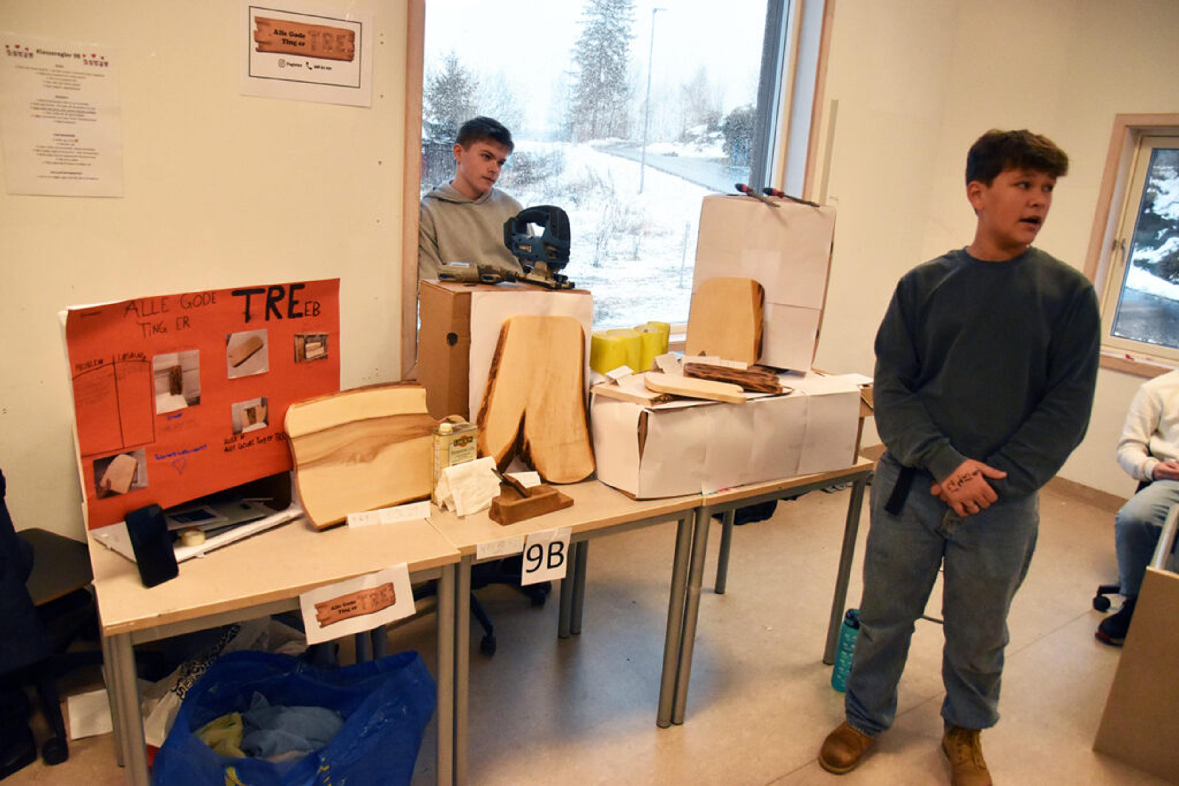 SKIKKELIG TREARBEID: Dennis Løvaas Christensen og Sander Skjeggestad har også finni fram til et bærekraftig produkt, nemlig trær som vokser i skauene rundt oss. En fantastisk presentasjon ble satt stor pris på – og alle deres produkter var allerede solgt før «eksamen». Foto: Stian Ormestad, ReAvisa.
