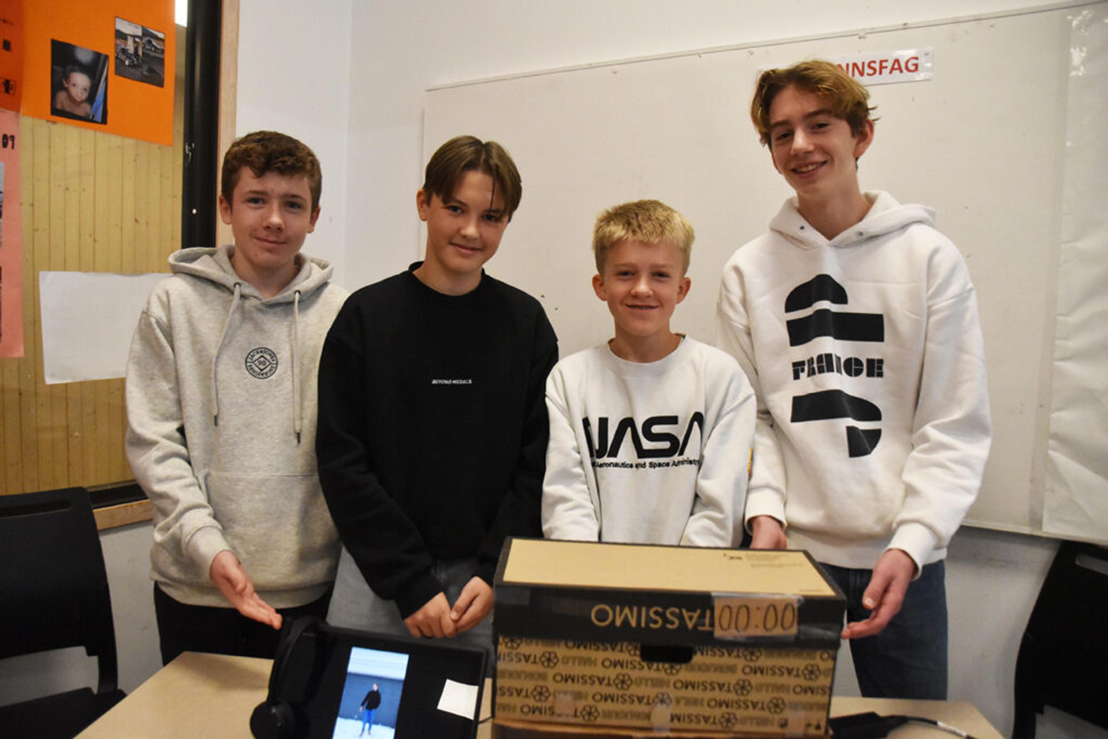 MEDISINDISPENSER: Lauritz Heum, Simon Holm, Jørgen Semb og Eirik Gulliksen mener det kan lages bedre medisindispensere enn de som allerede har kommi på markedet, der oppfølginga av om medisinen er tatt eller ikke blir bedre. Med smartere velferdsteknologi lar det seg gjøre, forklart i en reklamevideo – og med en flott modell. Foto: Stian Ormestad, ReAvisa.