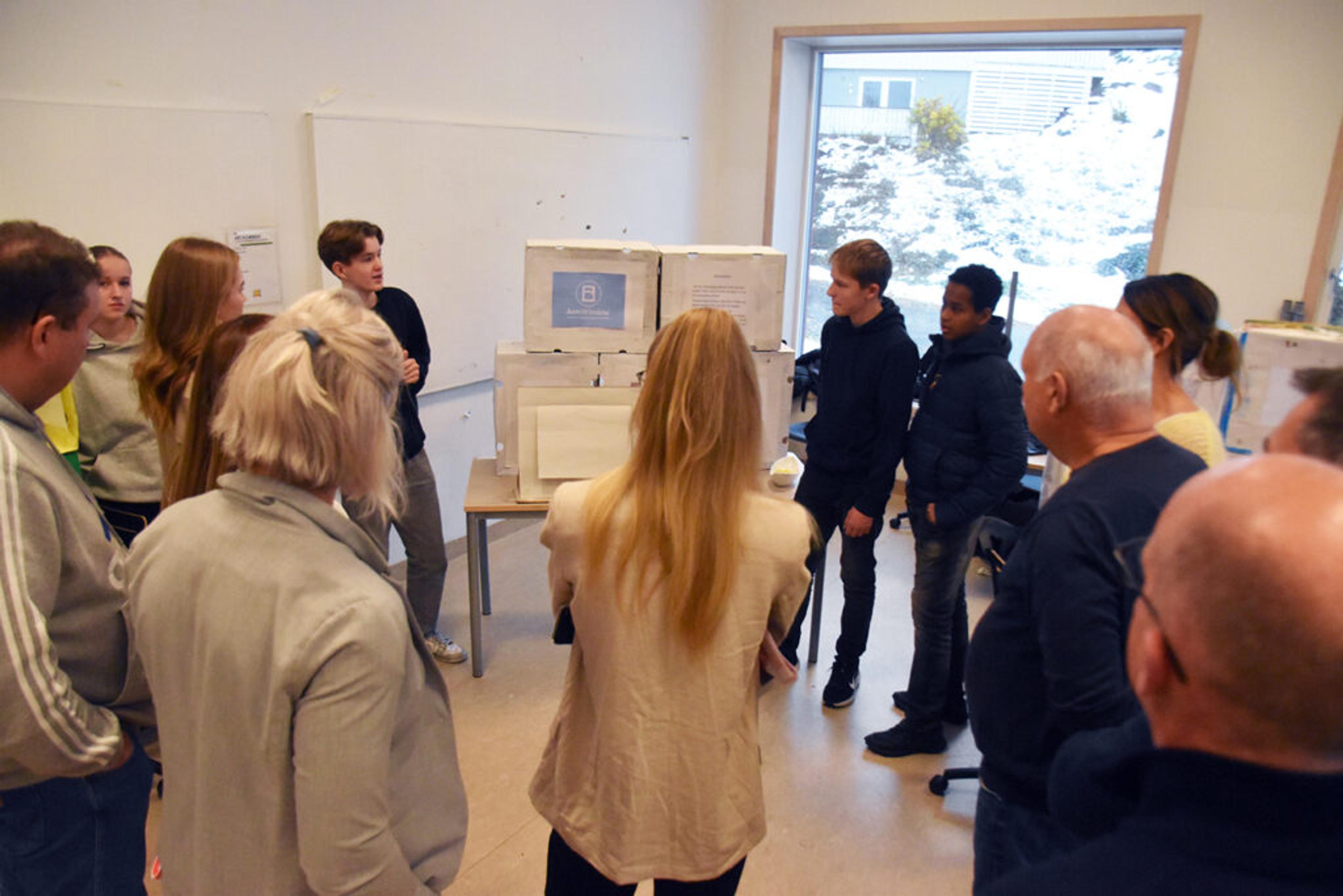 GODT OG GRUNDIG FORKLART: Gruppa hadde jobba godt med materiell og presentasjon, så det ble enkelt for to voksne karer fra juryen å skjønne ideen – og bli begeistra for den. Foto: Stian Ormestad, ReAvisa.