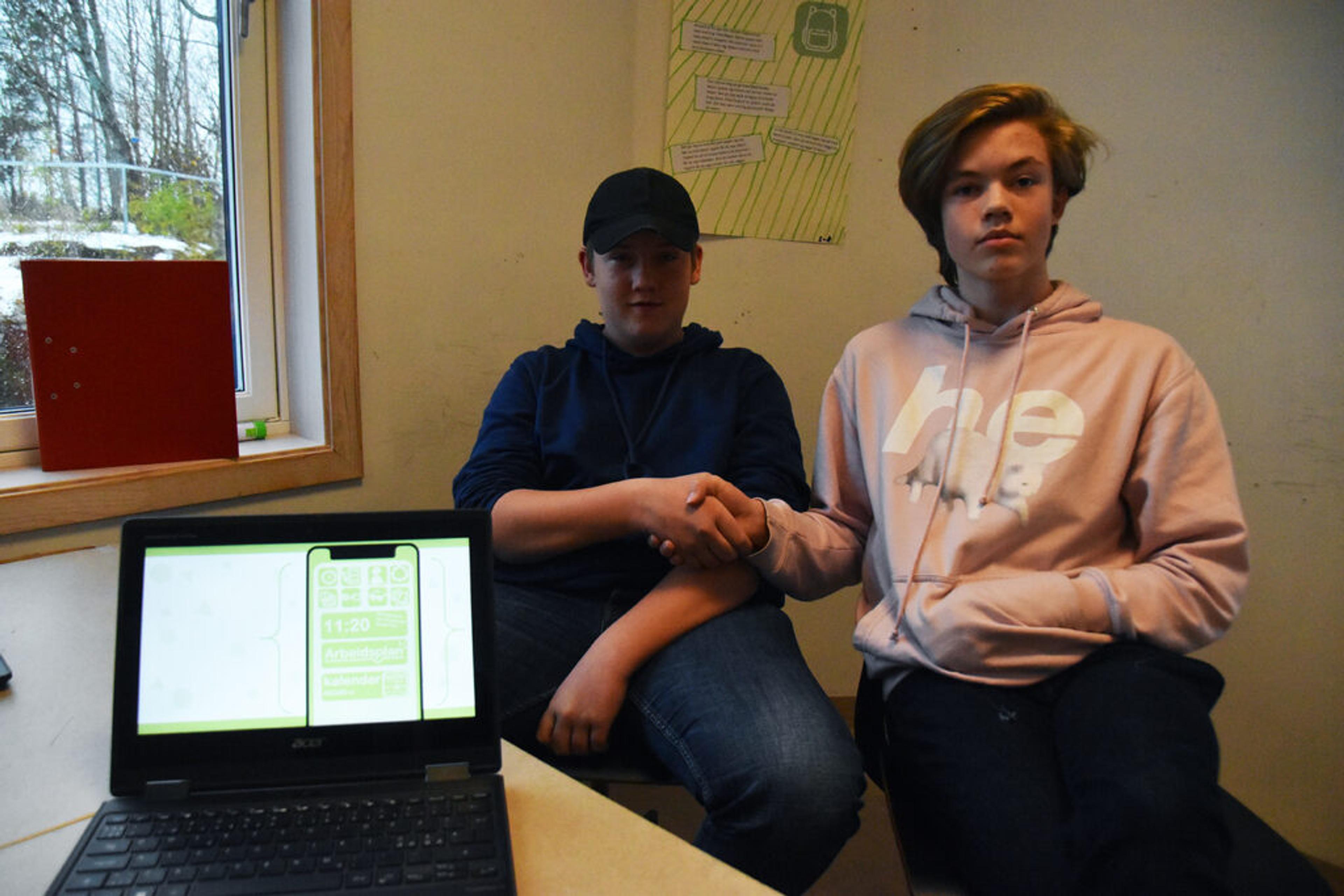 – DETTE TRENGS! Sondre Gulbrandsen og Alexander Erdal Furuheim forteller om noe de fleste kan kjenne seg igjen i: Du glemmer stadig noe til skolen. «Skoletid» skal hjelpe deg med å holde oversikten over hva du trenger når. Foto: Stian Ormestad, ReAvisa.