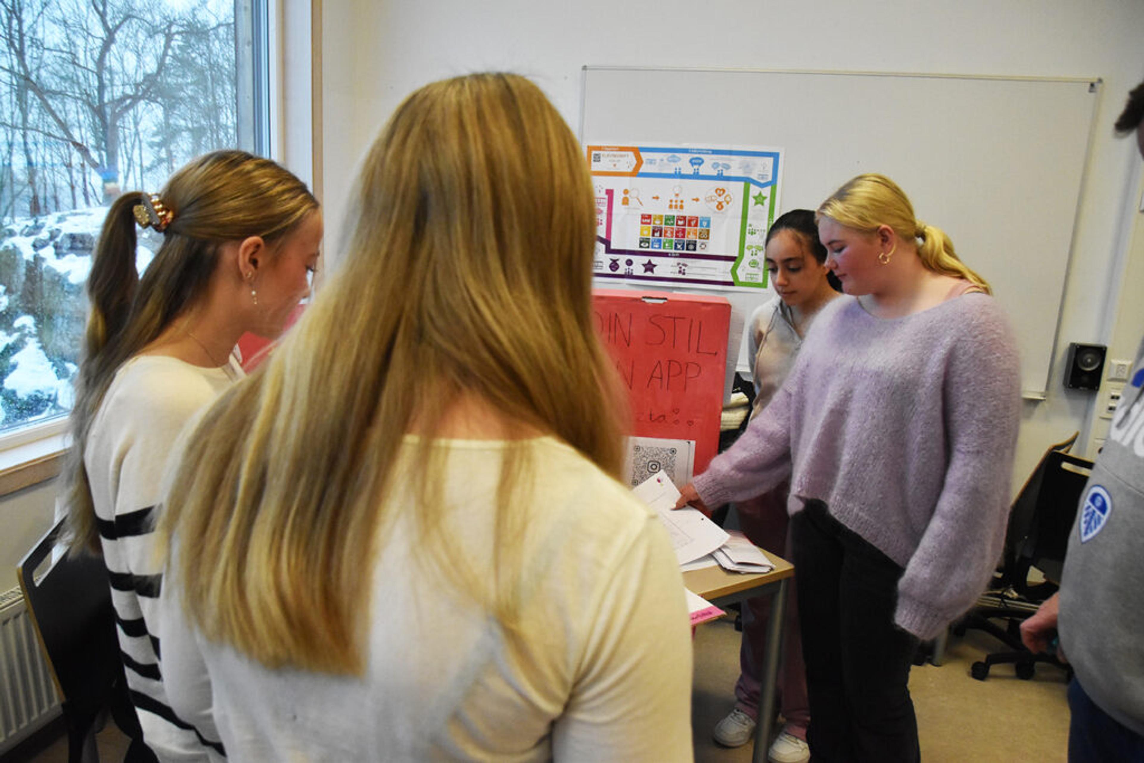PÅ PALLEN: Ulrikke Hestnes Kottum, Sofie Saaler Karlson, Maha Feras Almustafa og Pernille Meilegård Joberg står bak appen «Stylizta», som også holder orden på klesskapet ditt og resten av venninnegjengen. Her kan klær byttes, lånes bort, eller selges, og klærne du har lagt inn i loopen kan du og alle de andre i gruppa få opp som forslag til outfit. Foto: Stian Ormestad, ReAvisa.