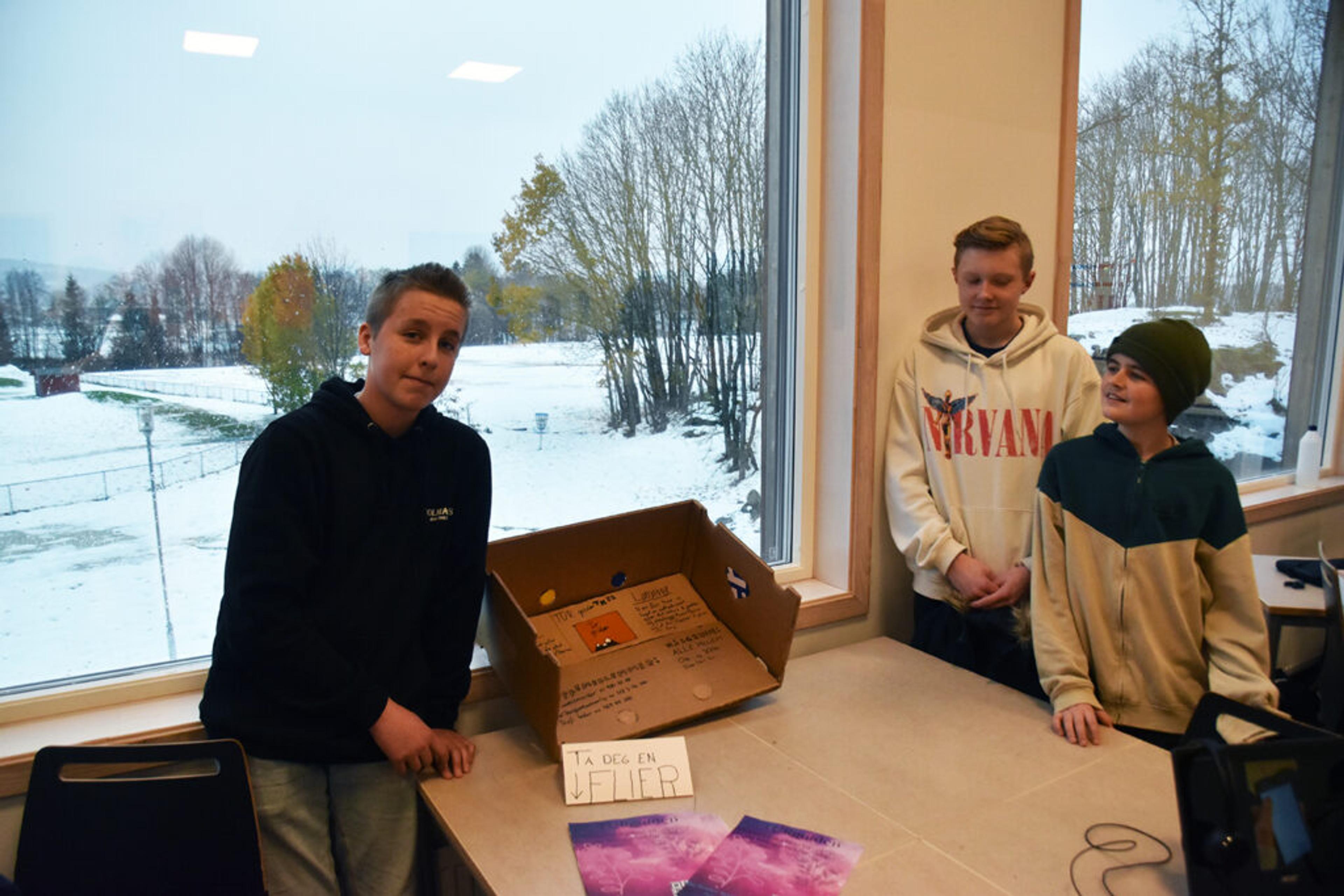 Marcus Bøhle Sviland, Jones H. M. Omar, Lukas Gabsevecius (Oscar Gilbert Hagard Andersen var sjuk den siste dagen av prosjektet, og mangler på bildet) presenterte ideen for juryen i skolekonkurransen på Revetal ungdomsskole, som de vant – dermed er de videre til fylkesfinalen i Ungt entreprenørskap. Foto: Stian Ormestad, ReAvisa.