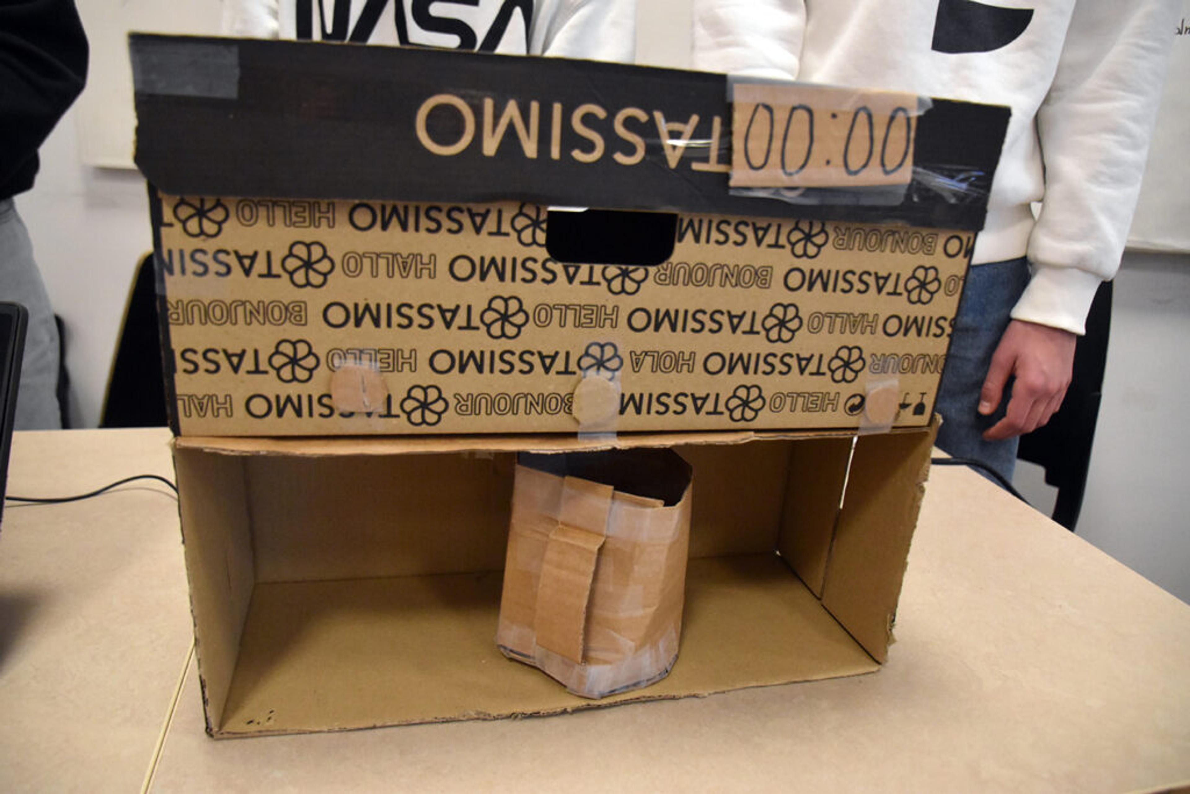MODELL I PAPP: Gruppa har gjort seg flid med en modell av medisindispenseren, der til og med koppen er laga av papp. Foto: Stian Ormestad, ReAvisa.