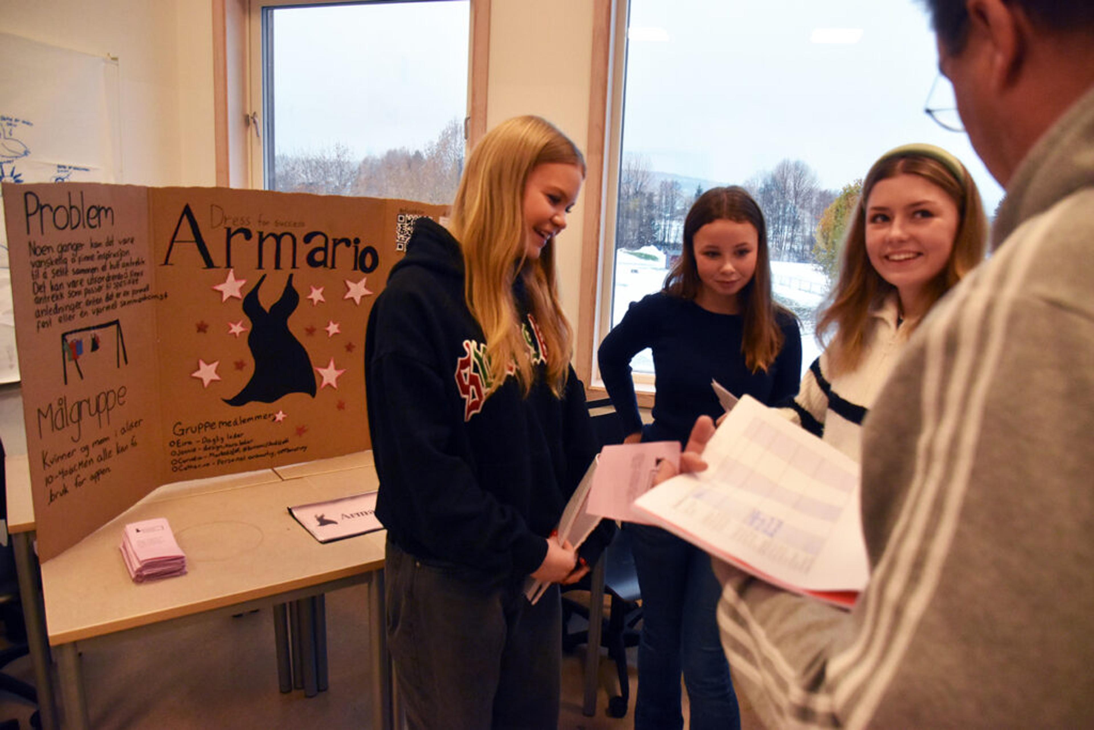 ARMARIO: Eira Thomina Asp, Jennie Sælid Eikeberg og Cornelia Kløven Rønnild viser fram sin knallgode ide for jurymedlem Trond Ekstrøm. Kort fortalt skal ideen gjøre klesskapet ditt mer bærekraftig. Foto: Stian Ormestad, ReAvisa.