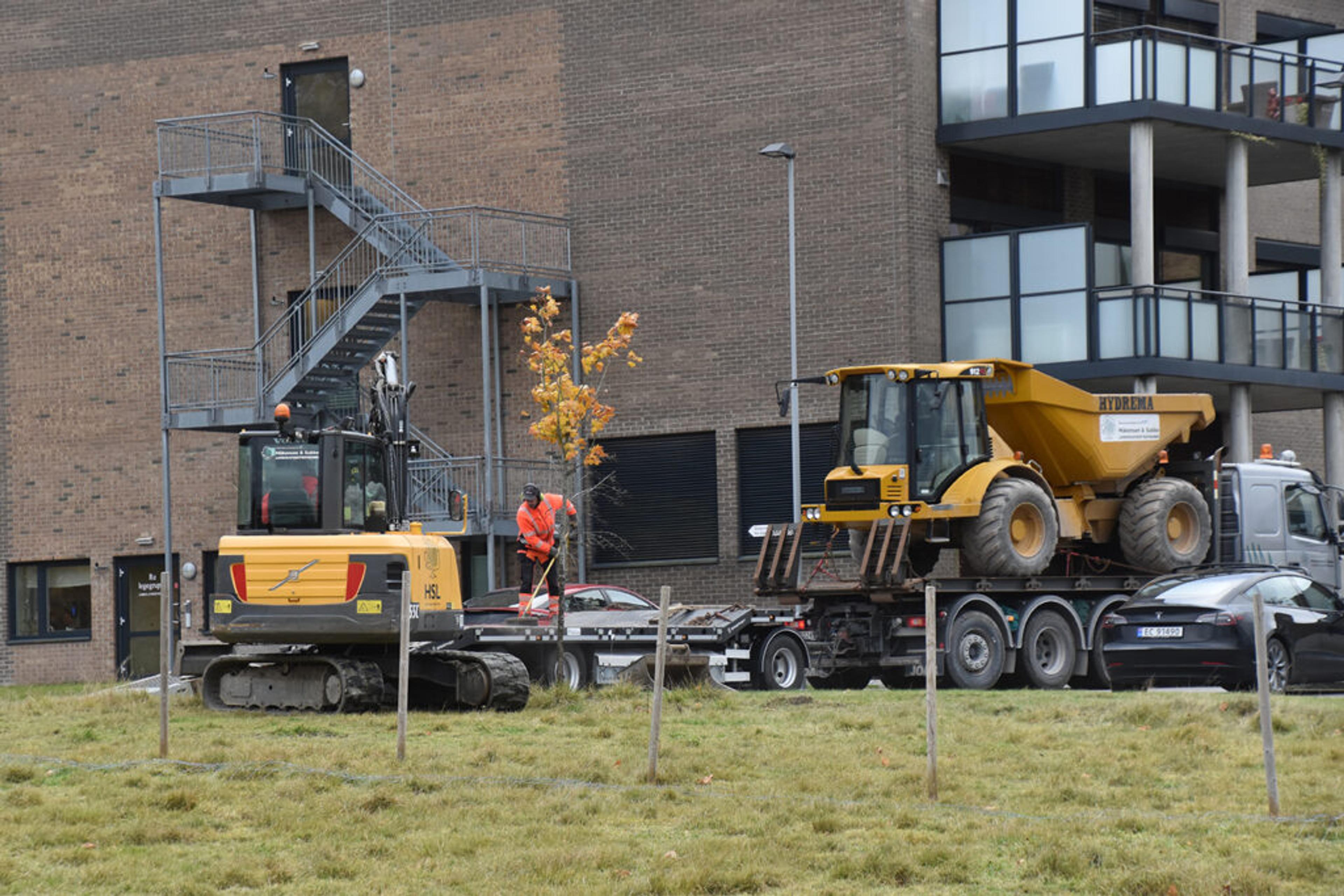 TRANSPORTERES INN: Maskinene kommer til Revetal, for å starte på det første av tre delprosjekt for uteområdene på Revetal. Foto: Stian Ormestad, ReAvisa.