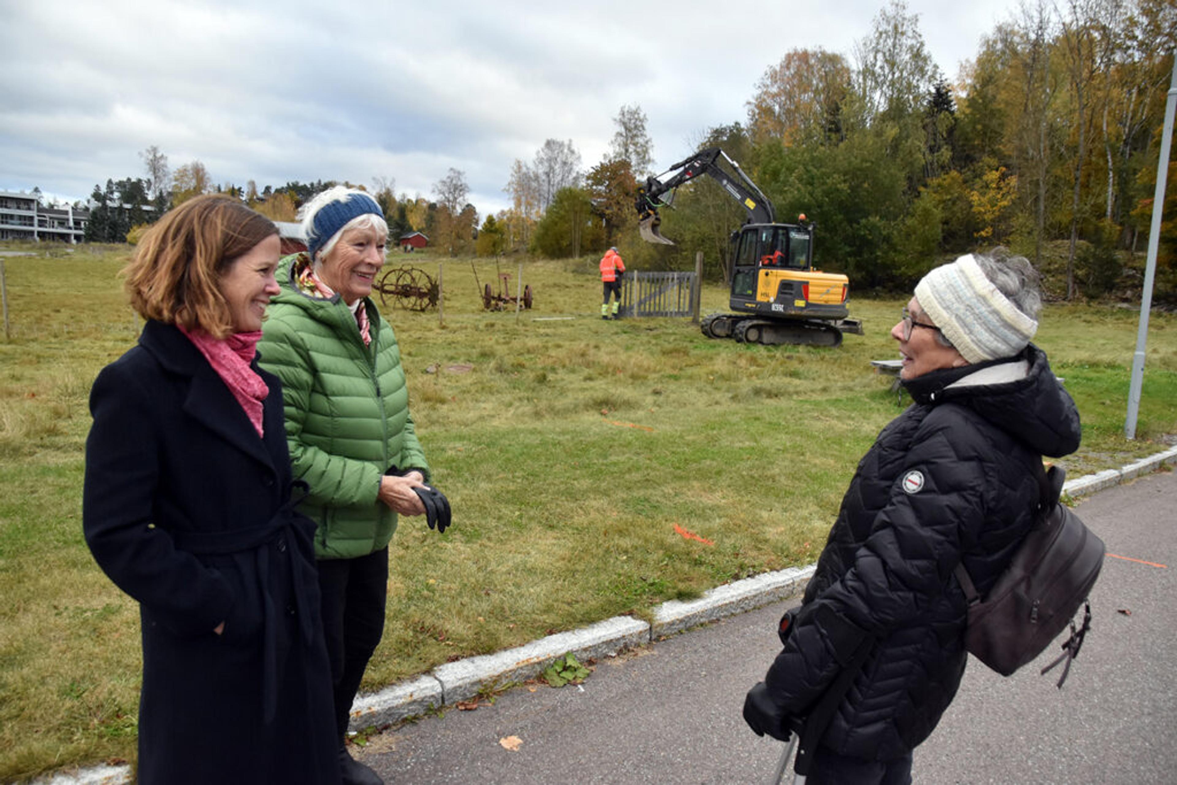 ARBEIDENE ER I GANG: Prosjektleder Marthine Søyland Hoel i prat med Karin Lian og Solveig Myrstad utafor Re helsehus. Foto: Stian Ormestad, ReAvisa.