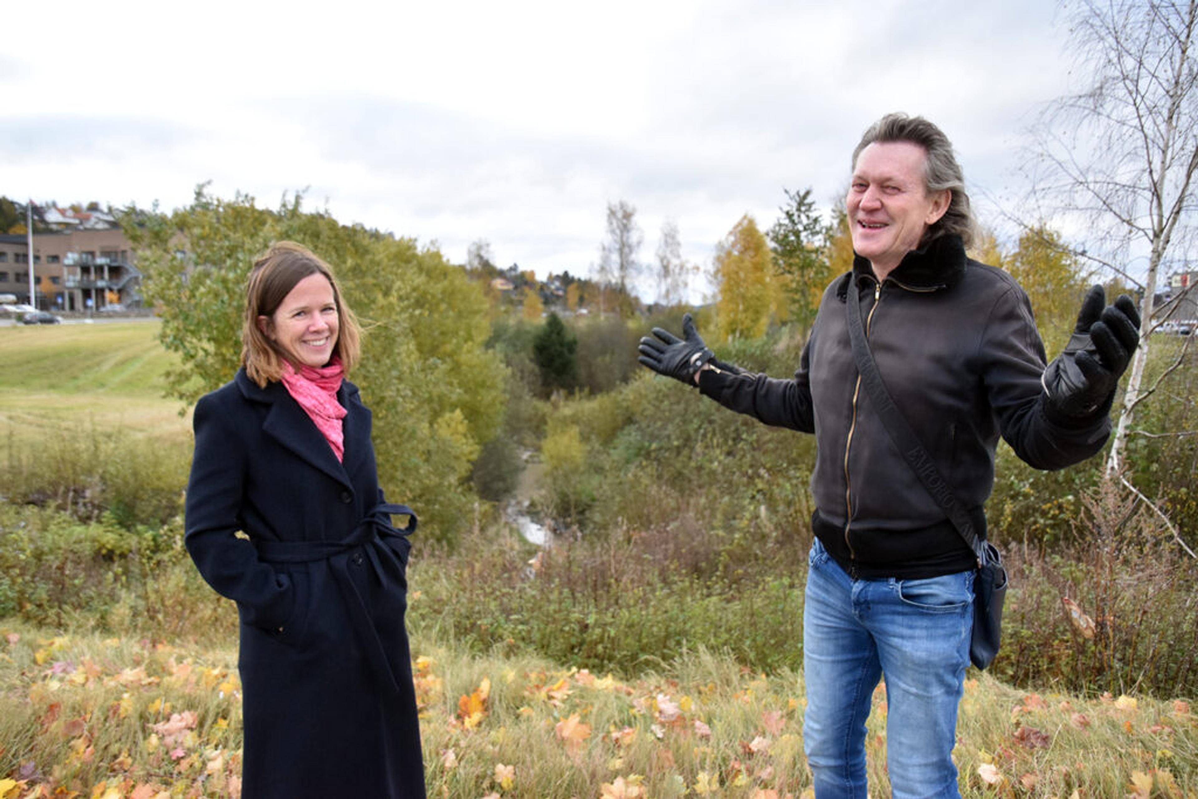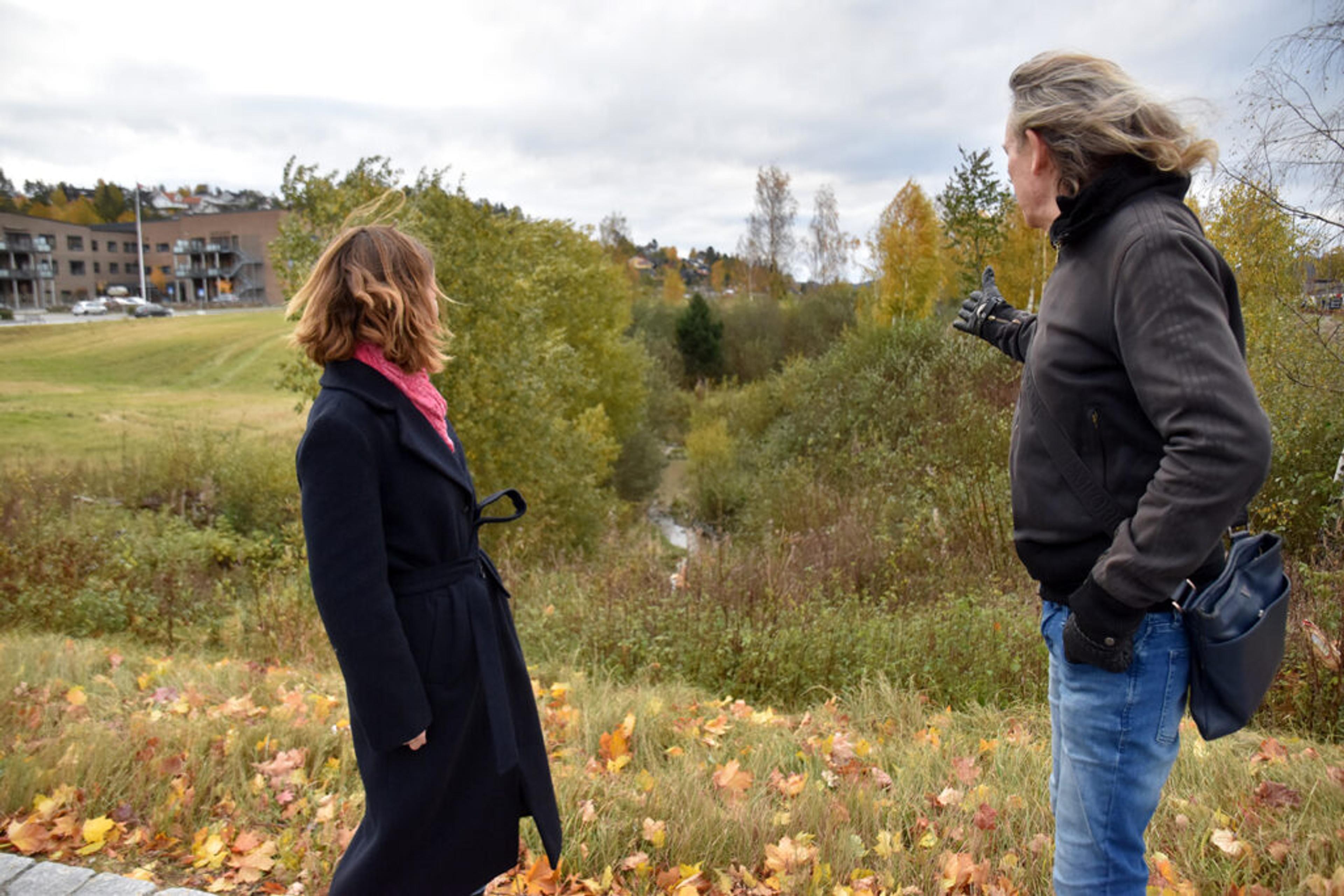STORE PLANER FOR EN LITEN BEKK: Revetalbekken kan skimtes bak Marthine Søyland Hoel, by- og stedsutvikler i Virksomhet folkehelse, klima og stedsutvikling i Tønsberg kommune, og Rainer Stange, anerkjent landskapsarkitekt fra Re. Foto: Stian Ormestad, ReAvisa.