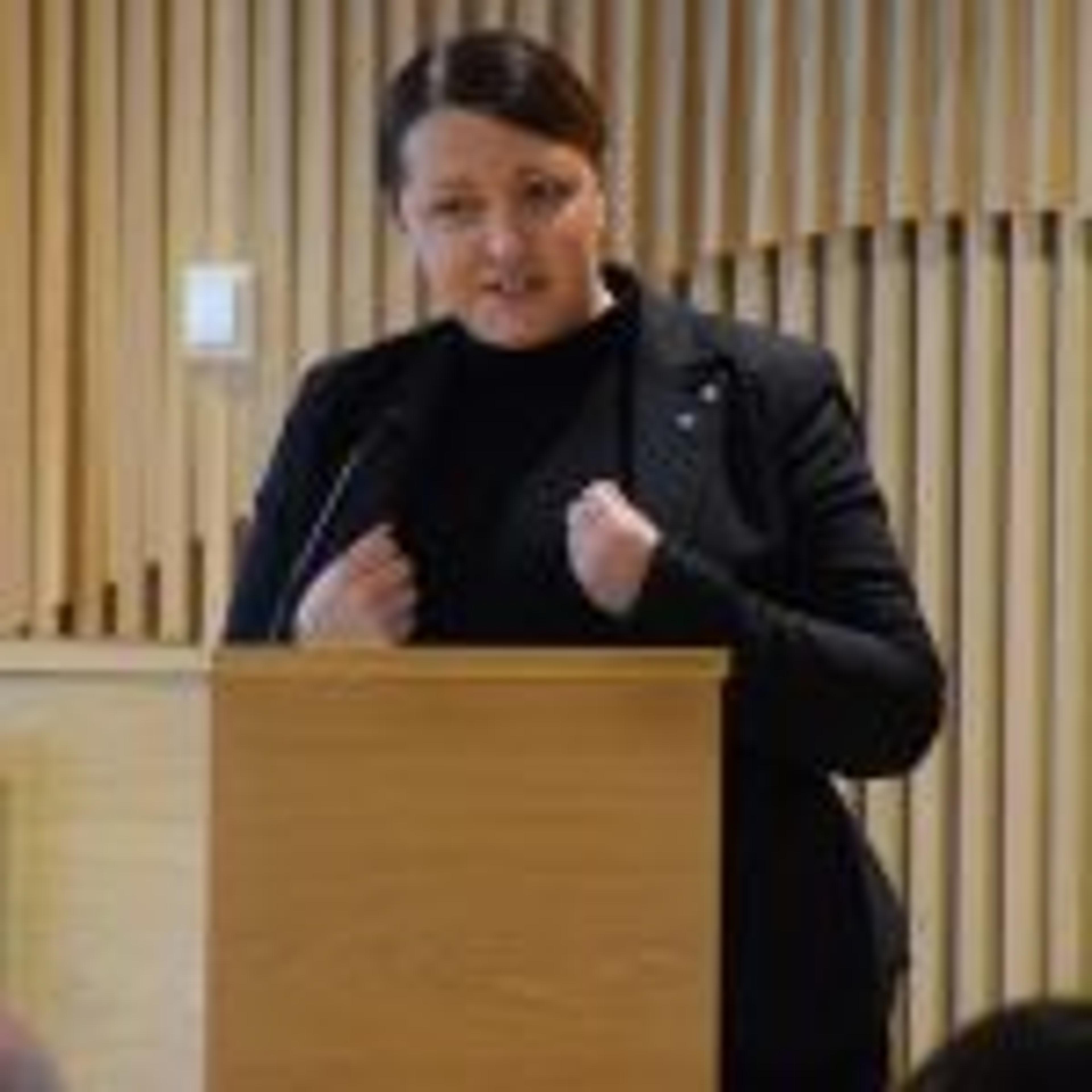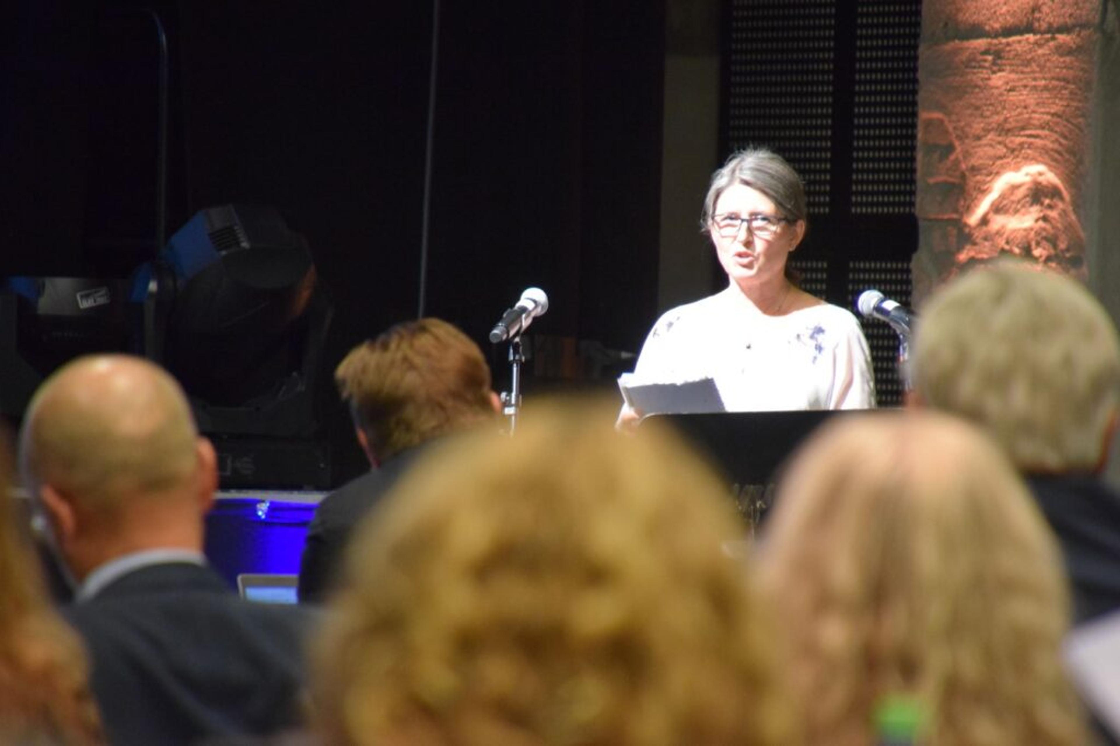 SISTE GANG PÅ TALERSTOLEN: Heidi Myhre tar ordet i oktober-møtet, siste gang kommunestyret var fysisk samla i høst. Foto: Stian Ormestad.