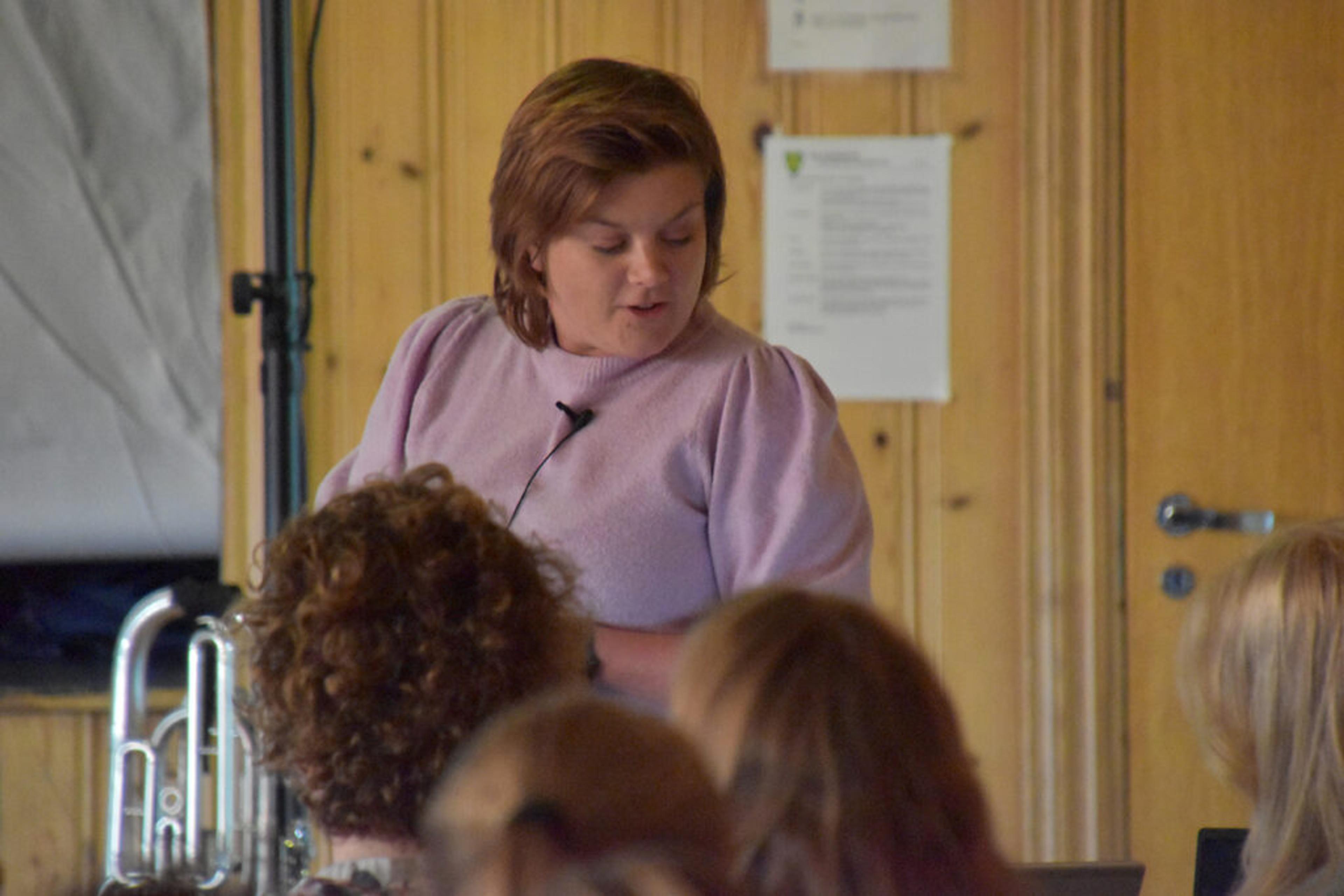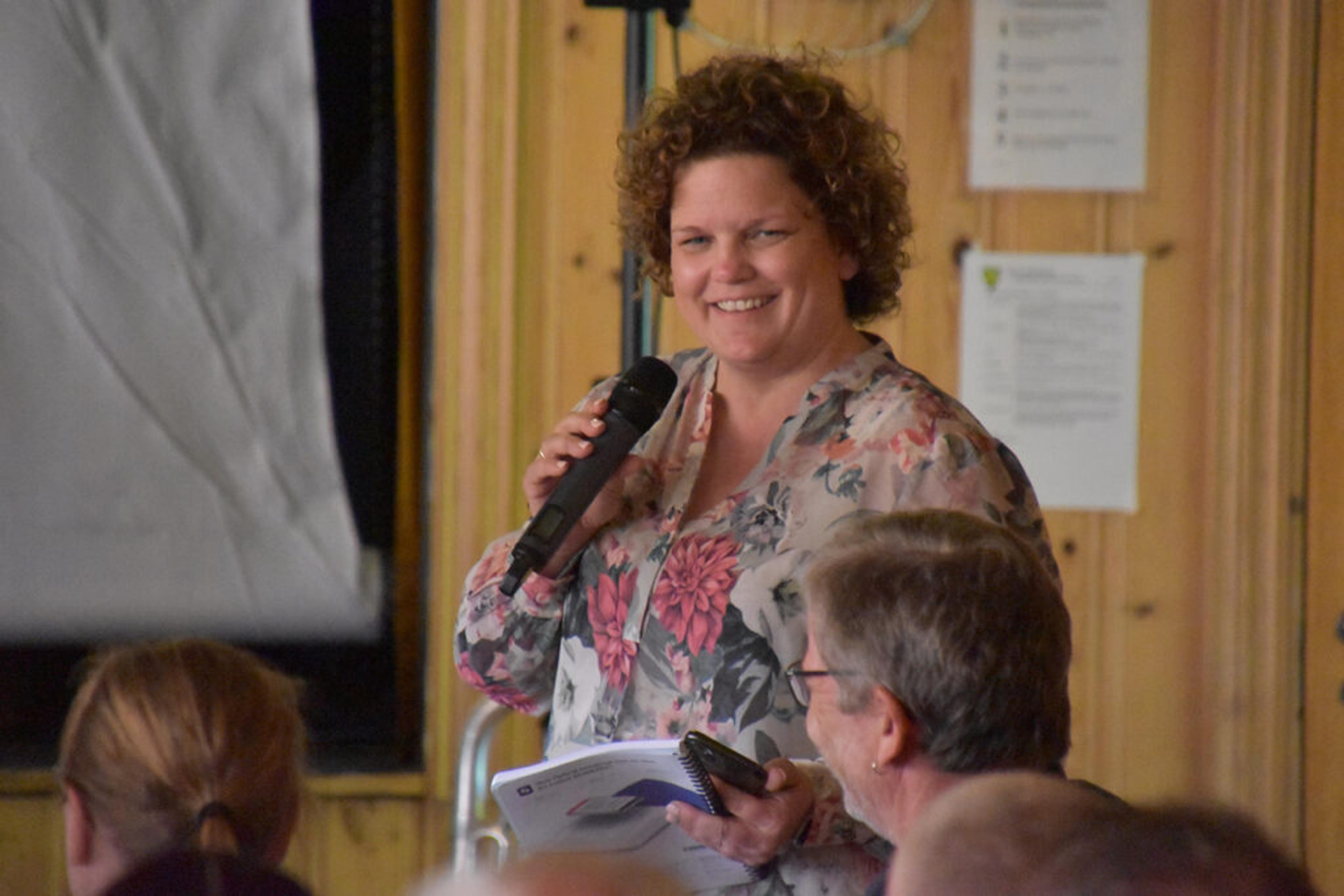 LEGGER FRAM TALLENES TALE: Etter snaut to uker med innbyggerundersøkelse på nett, har 199 svart. Og et stort flertall er i mot at barna skal gå på Barkåker skole, og mange svarer at de vil vurdere å flytte fra Undrumsdal dersom skolen legges ned. Hilde Bråten presenterte de foreløpige resultatene fra innbyggerundersøkelsen. Foto: Stian Ormestad.