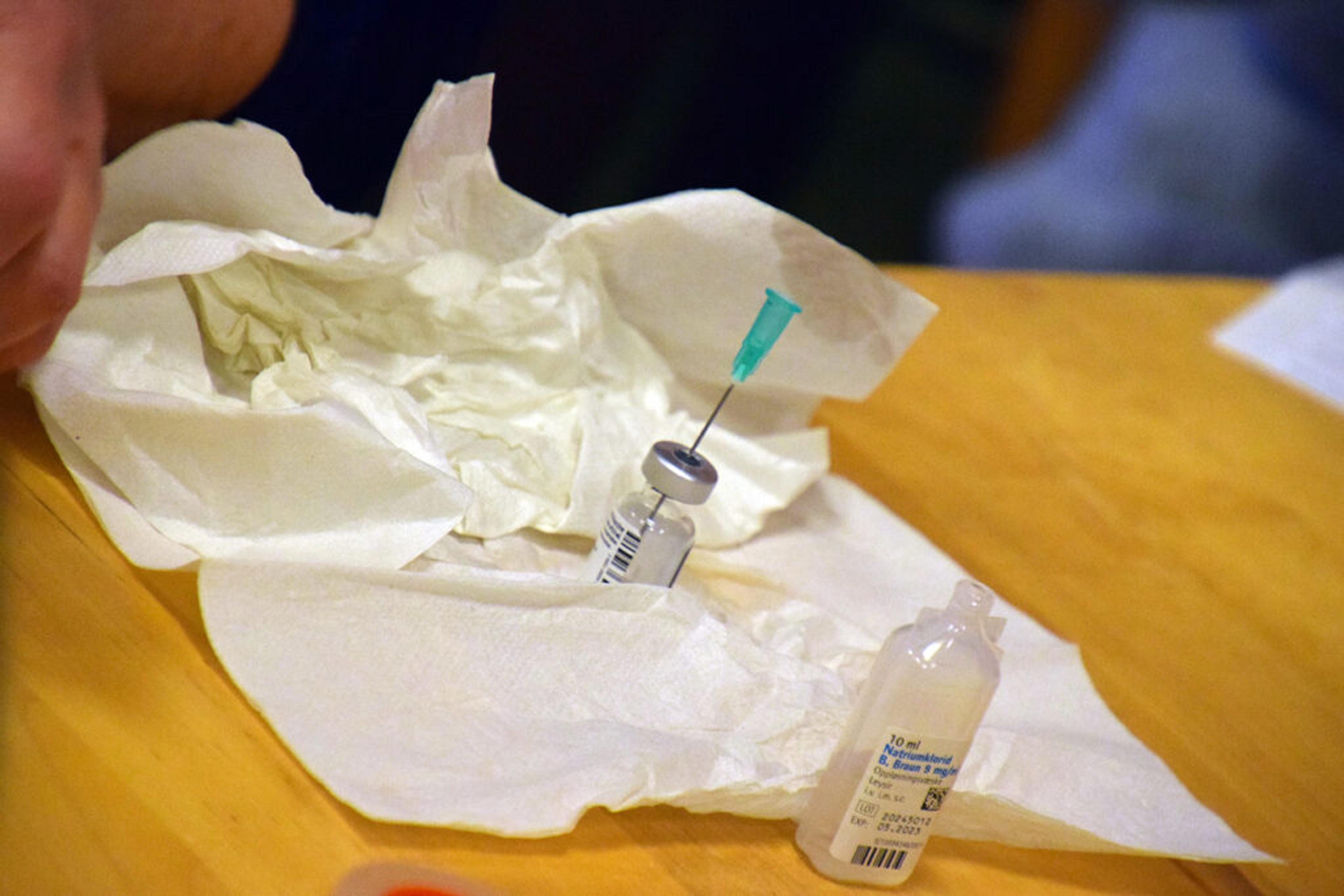 DEN HISTORISKE FØRSTE VAKSINEDOSA: Her har den første vaksinedosa i Re blitt forskriftsmessig blanda og venter på å bli satt. Foto: Stian Ormestad.