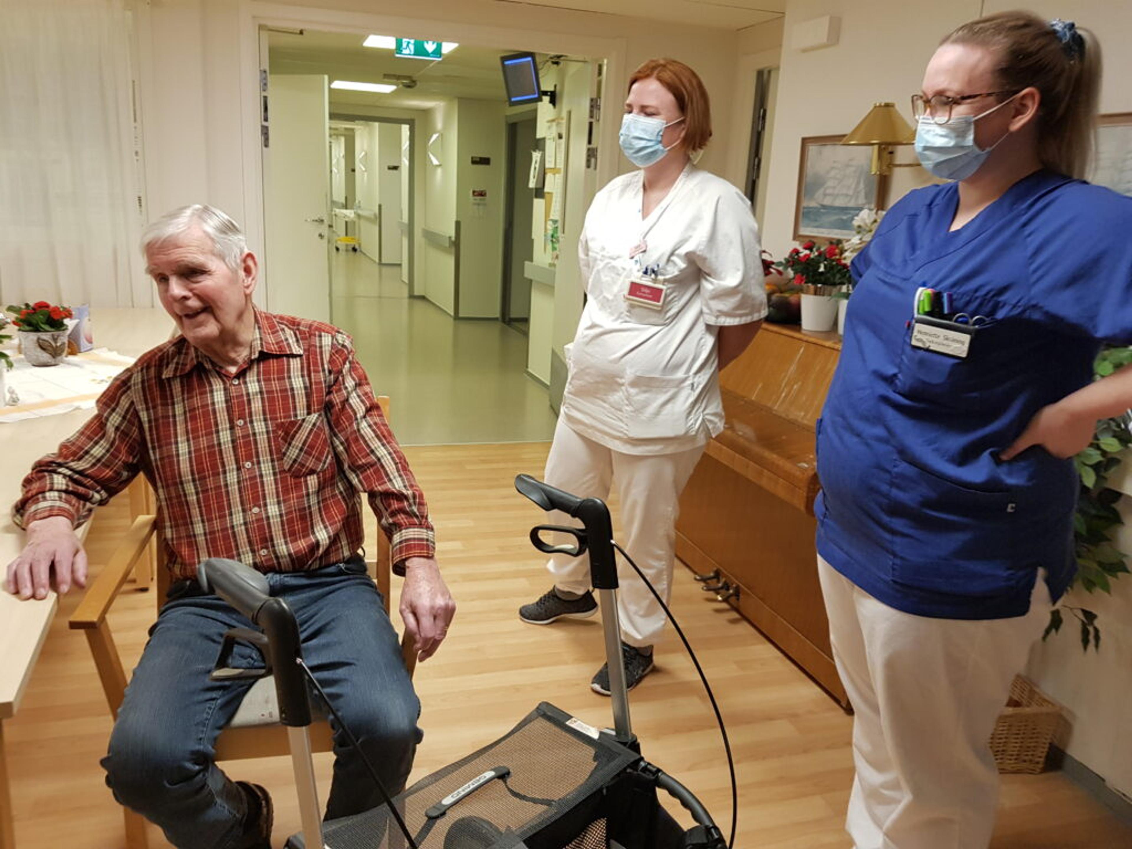 FØRSTE STIKK: Bjarne Repål (85) fikk den første koronavaksinen i nye Tønsberg kommune, på Træleborg sjukehjem i dag onsdag 6. januar 2020. Til uka, tidligst mandag 11. januar, blir første vaksinestikk satt her i Re, på Re helsehus. Foto: Tønsberg kommune.