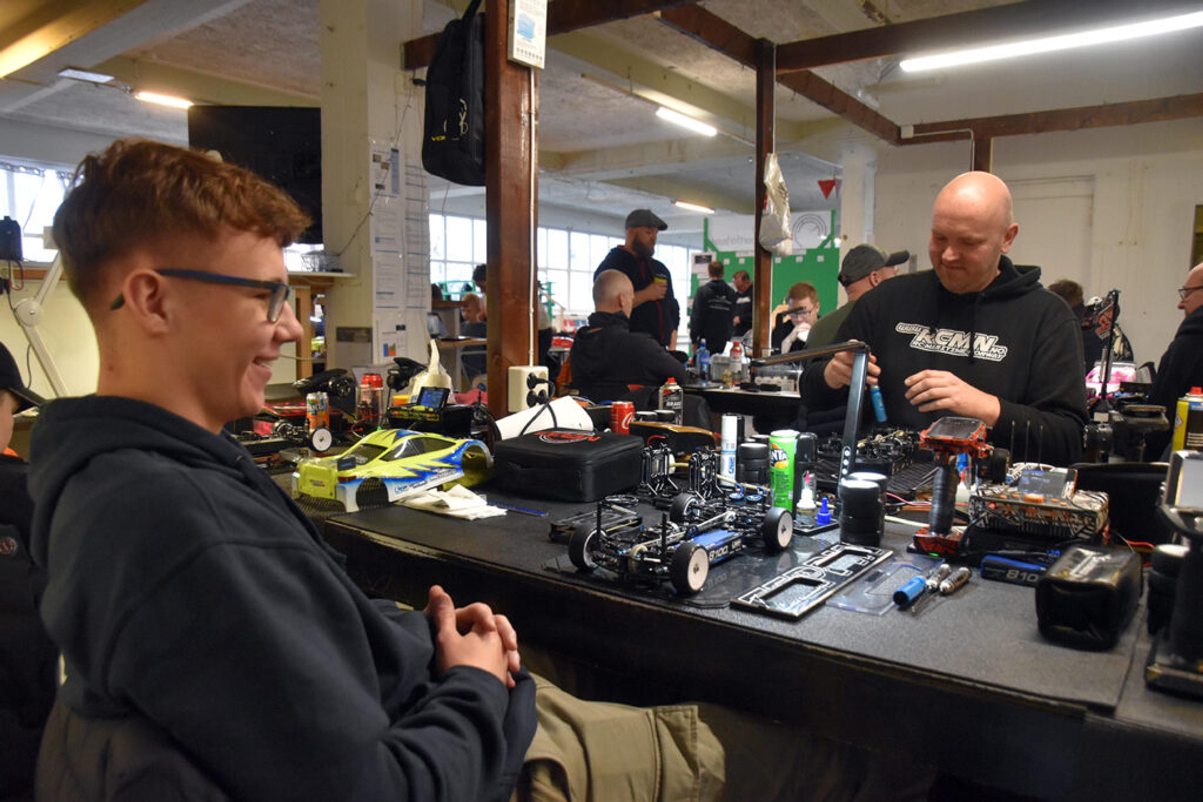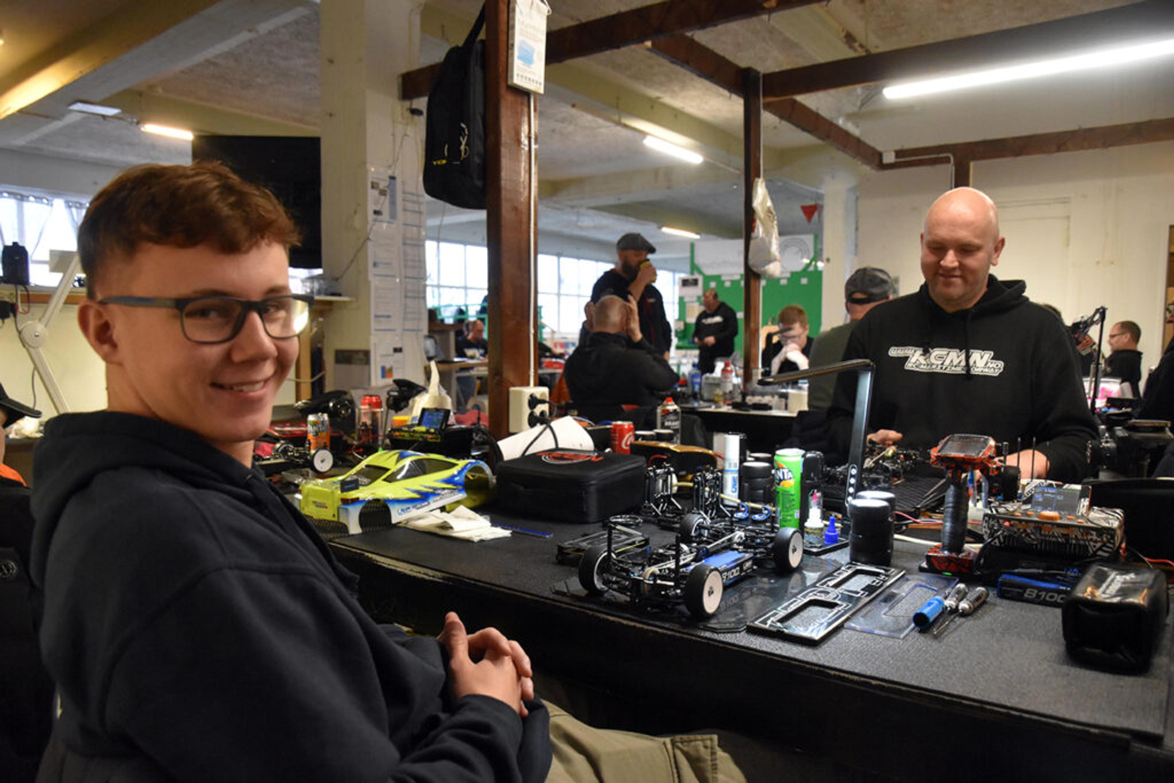 PSYKER SEG OPP TIL FØRSTE START: Olav Frostad Dahle (16) er storfavoritt på hjemmebane, i Norgescupen hos Våle modellbilklubb denne helga. Sjøl mener han at hans mentor Helge Johannessen på andre sida av bordet er en enda større favoritt. – Nei, her har nok eleven passert læreren for lengst, sier Helge. Foto: Stian Ormestad, ReAvisa.