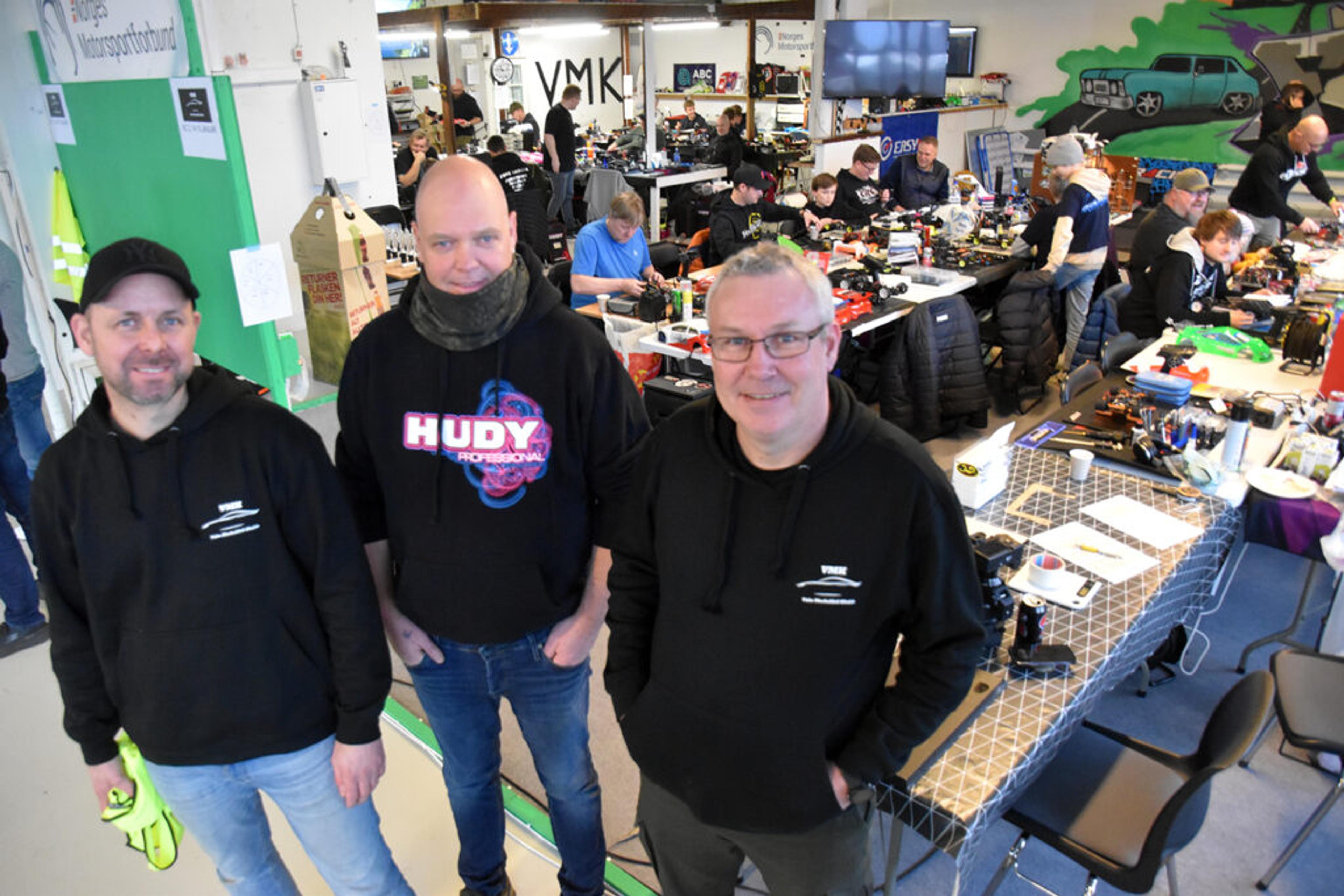 FULL FART: Marius Akerholt, nestleder, Tommy Dahle, teknisk kontrollant og styremedlem, og Eivind Heggem, daglig leder, huser Norgescup i touring, bilsport i liten skala, denne helga, 14. – 15. januar 2023. Foto: Stian Ormestad, ReAvisa.