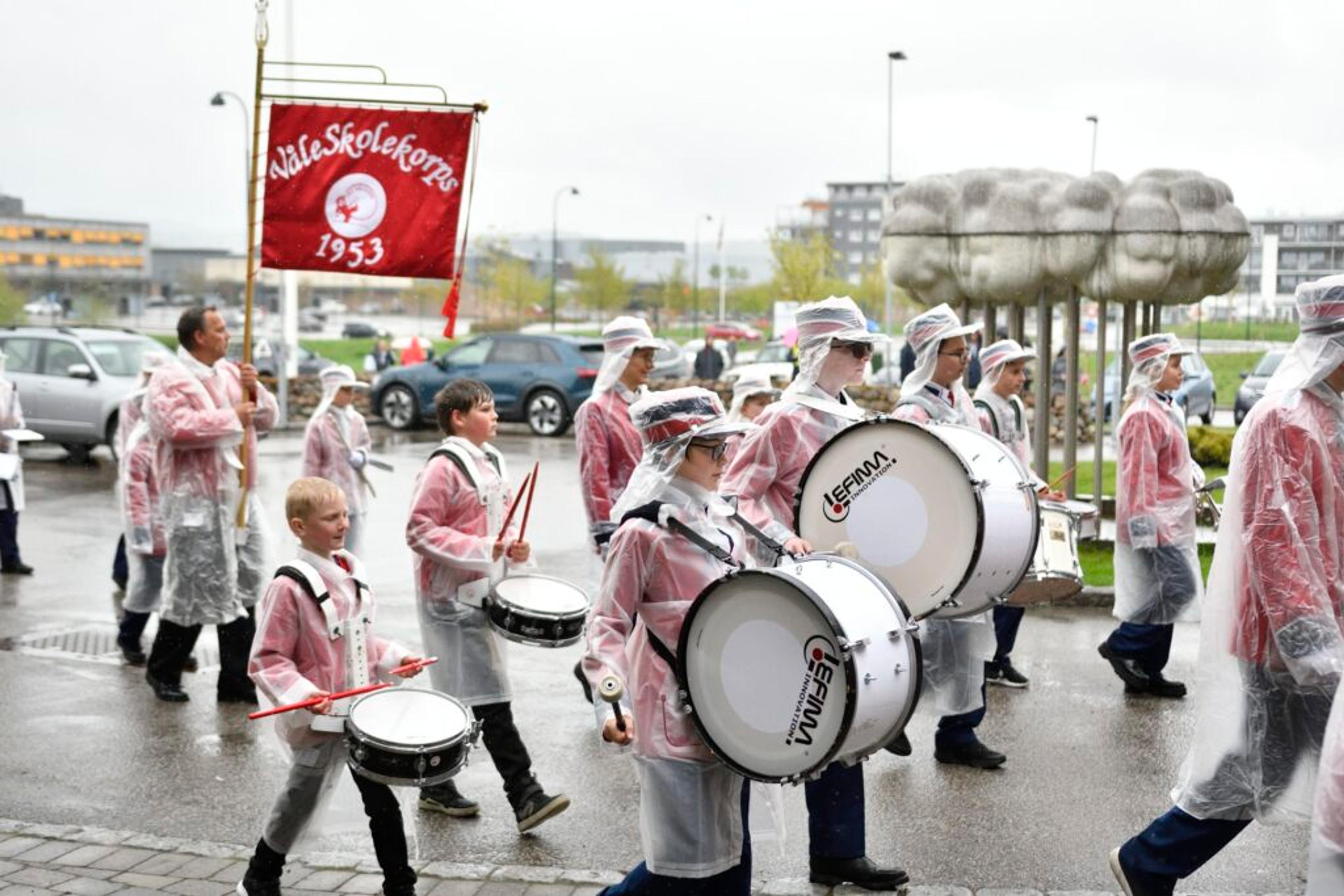 I ALL SLAGS VÆR, I 70 ÅR: Våle skolekorps i aksjon på en våt 17. mai for to år siden. Arkivfoto: Harald_Daniel_Nordlie.